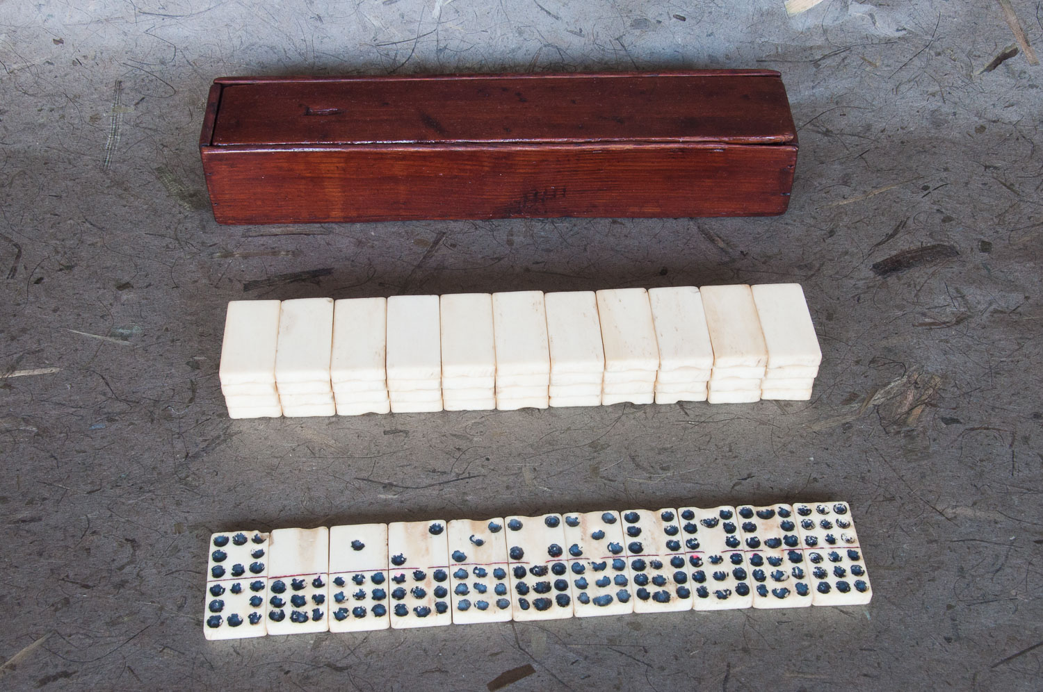 Bederatzi puntuko dominoa. Berrogeita hamabost fitxa pintatu gabe. 53 mm x 25 mm. Kutxa.