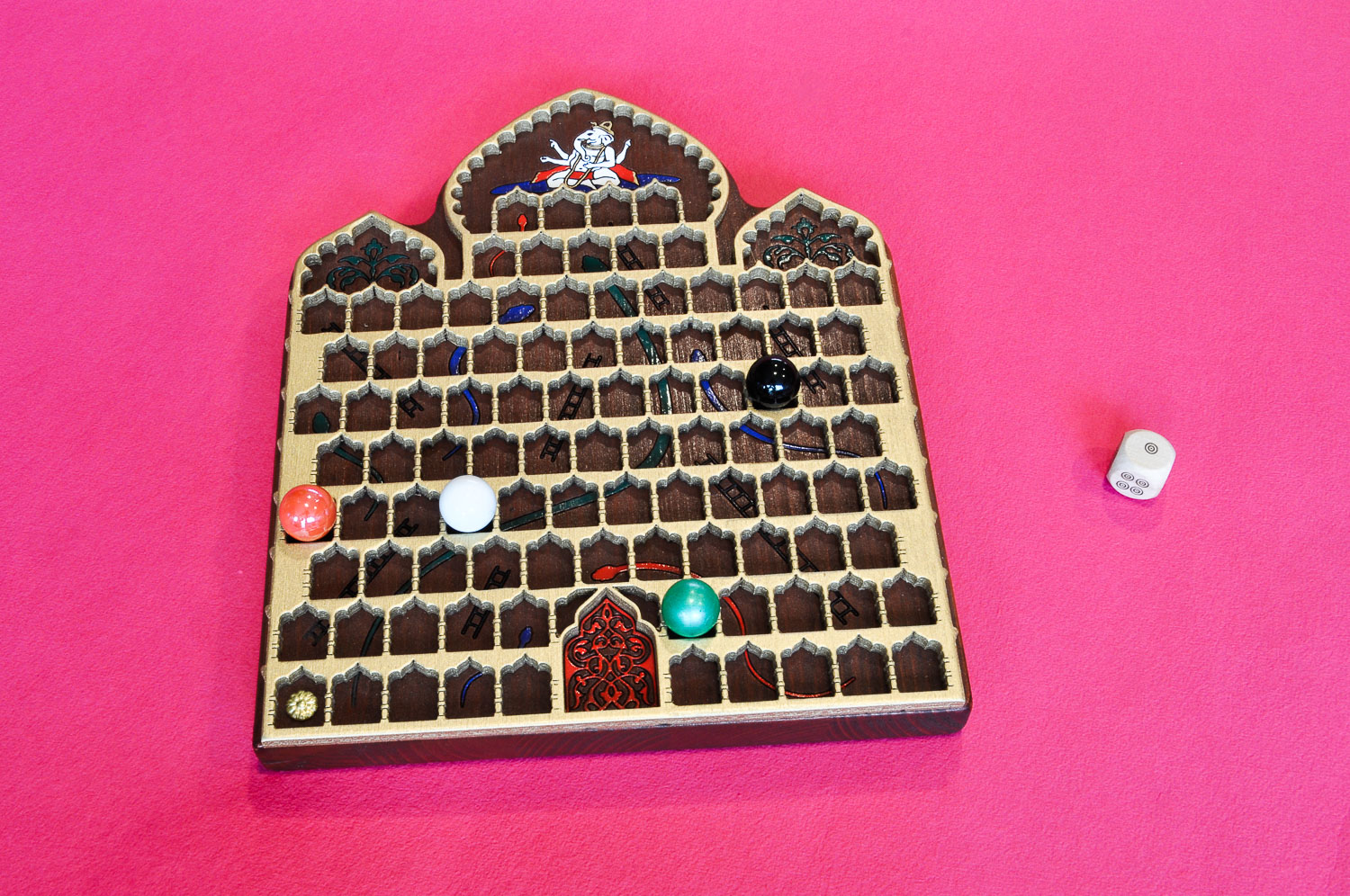 Taulak 99 lauki ditu: 10-10-11-12-11-12-11-12-5-4-1 lerroetan. Laukiak lotuz, zazpi eskailera gora eta zazpi suge behera daude. Lau bola: beltza, berdea, gorria eta zuria, 16 mm. Dado bat.