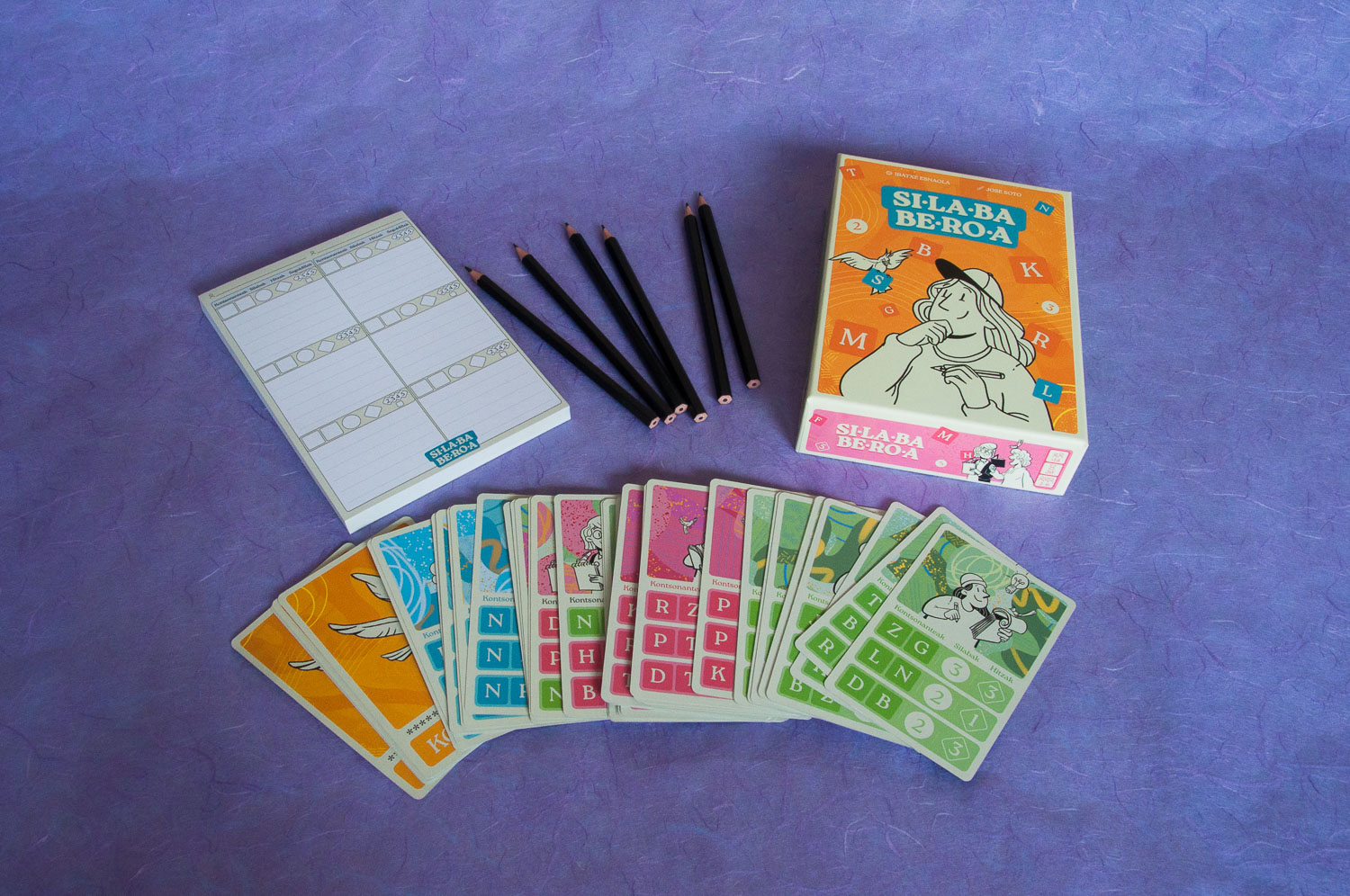 Berrogeita hamabost karta, bi aldeetatik erabilgarriak. Lau maila daude: erraza, ertaina, nahasia eta seguidillak. 110 mm × 70 mm. Sei arkatz. Libreta.