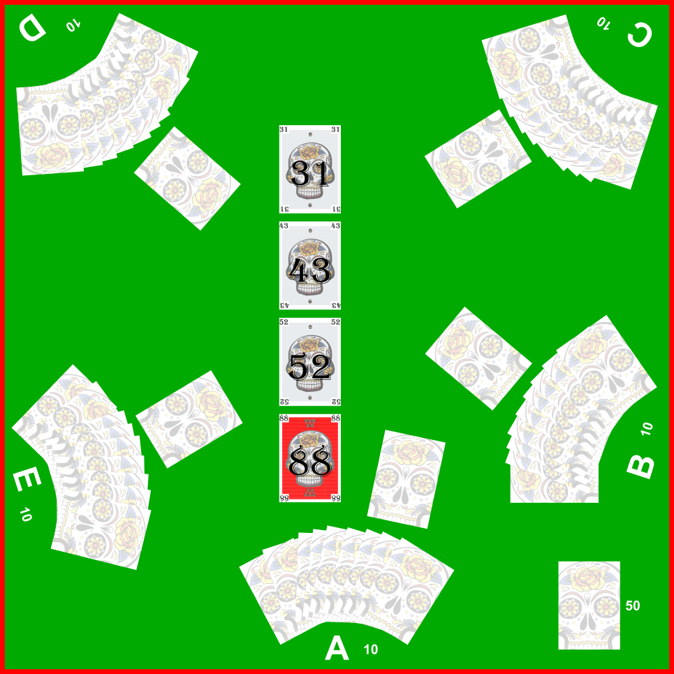 | A jokalariak lau karta jarri ditu mahai erdian ahoz gora eta, ondoren, hamarna karta banatu dizkie jokalariei. 50 karta eskutik kanpo geratu dira. Jokalariek karta bana aukeratu dute. | Jokalariek aukeratutako kartak ahoz gora jarri dituzte: A (33) jokalaria hasiko da; ondoren, C (35), B (49), E (55) eta D (93) jokalariek jarriko dituzte beraienak. | Jokalariek kartak lerroetan jarri dituzte eta bigarren karta aukeratu dute. |