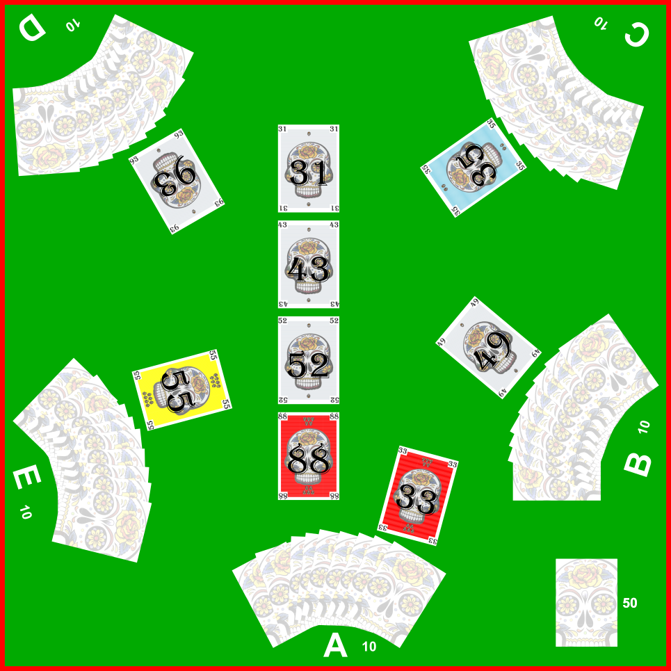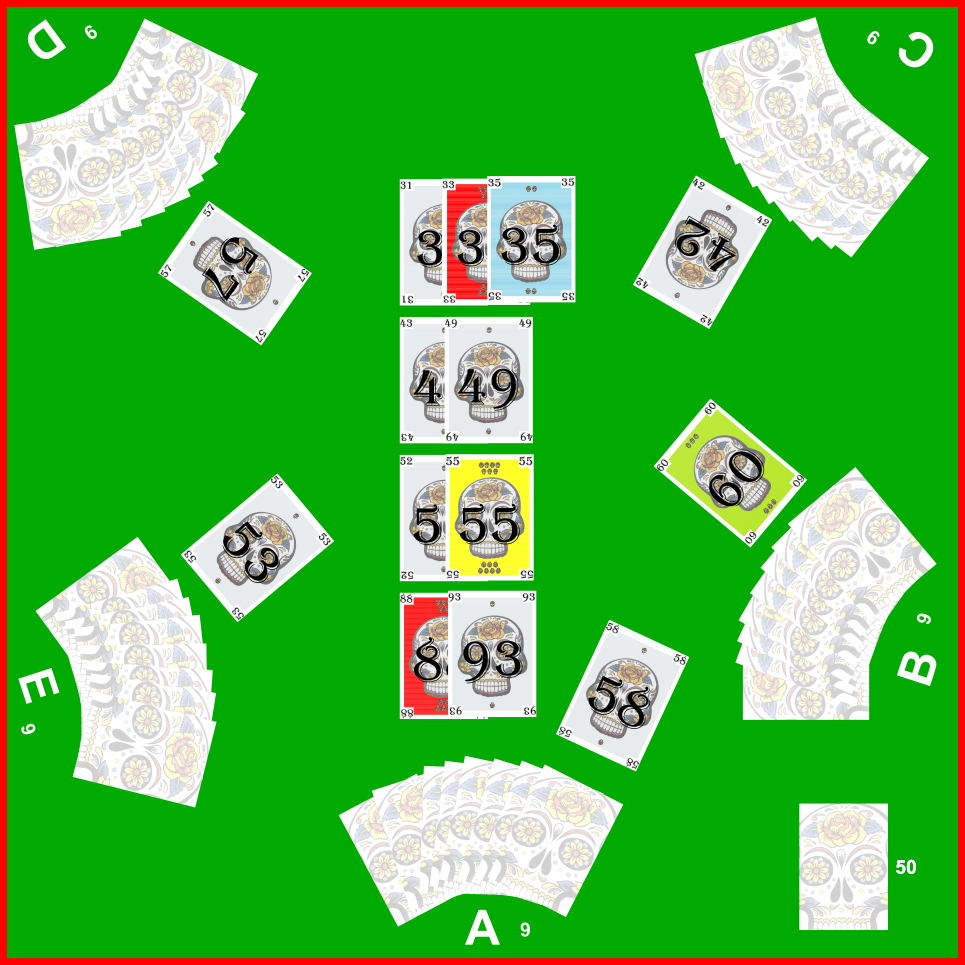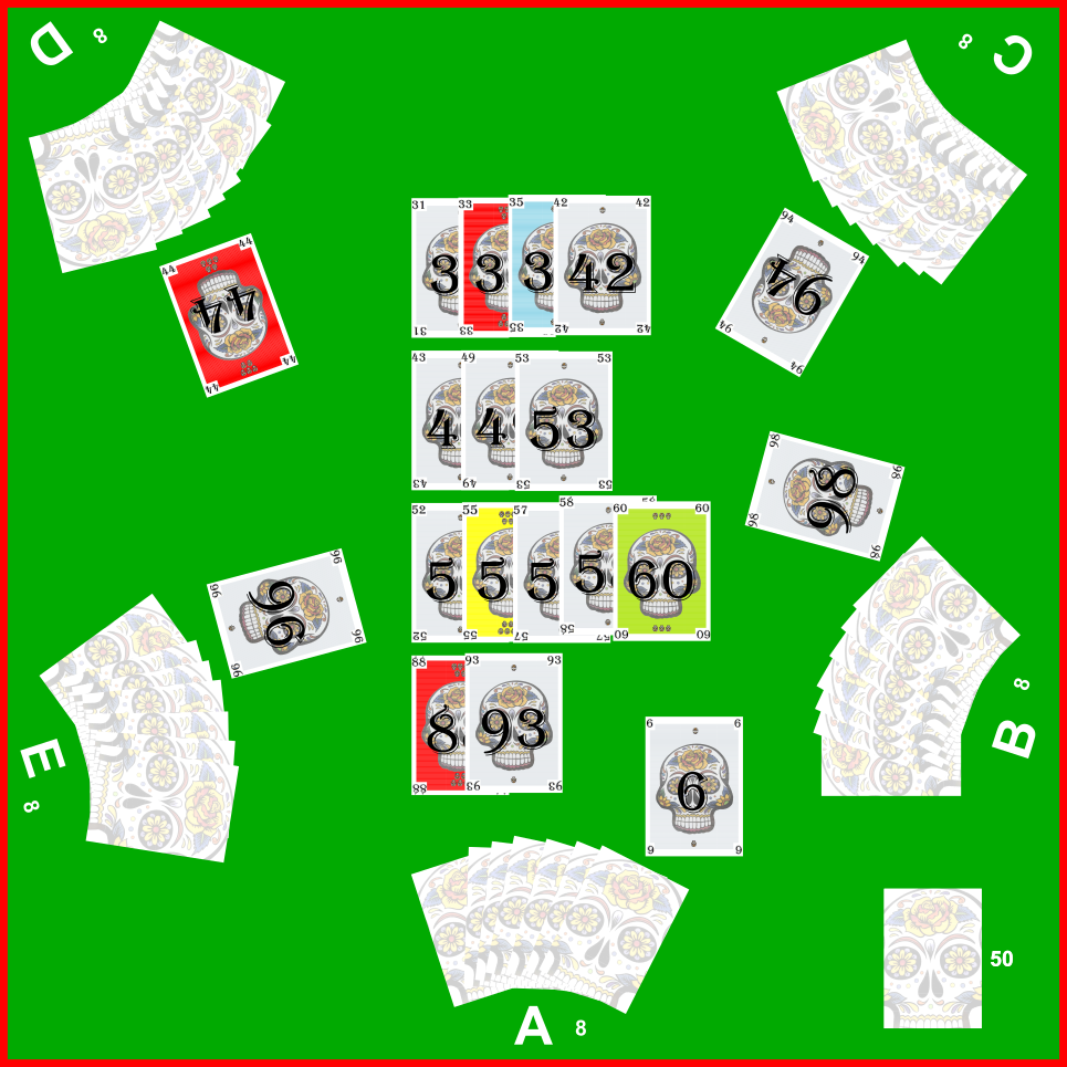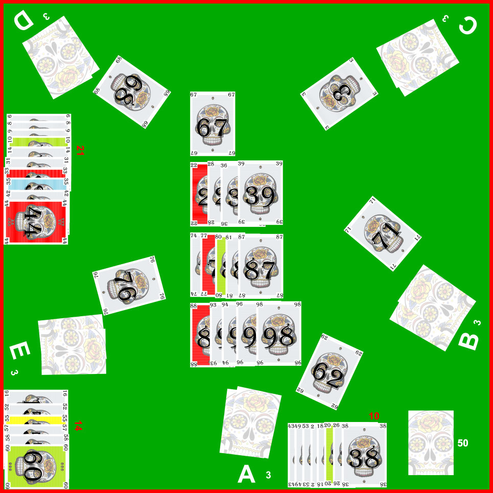 | Jokalariek aukeratutako kartak ahoz gora jarri dituzte: C (42) jokalaria hasiko da; ondoren, E (53), D (57), A (58) eta B (60) jokalariek jarriko dituzte beraienak. (A-0, B-0, C-0, D-0, E-0) | Jokalariek kartak lerroetan jarri dituzte eta hirugarren karta aukeratu dute. Hirugarren lerroan 5 karta daude. Horretan hurrengo karta jartzen duenak aurrekoak eramango ditu. | Jokalariek aukeratutako kartak ahoz gora jarri dituzte: A (6) jokalaria hasiko da; ondoren, D (44), C (94), E (96) eta B (98) jokalariek jarriko dituzte beraienak. |
