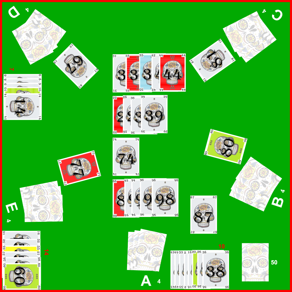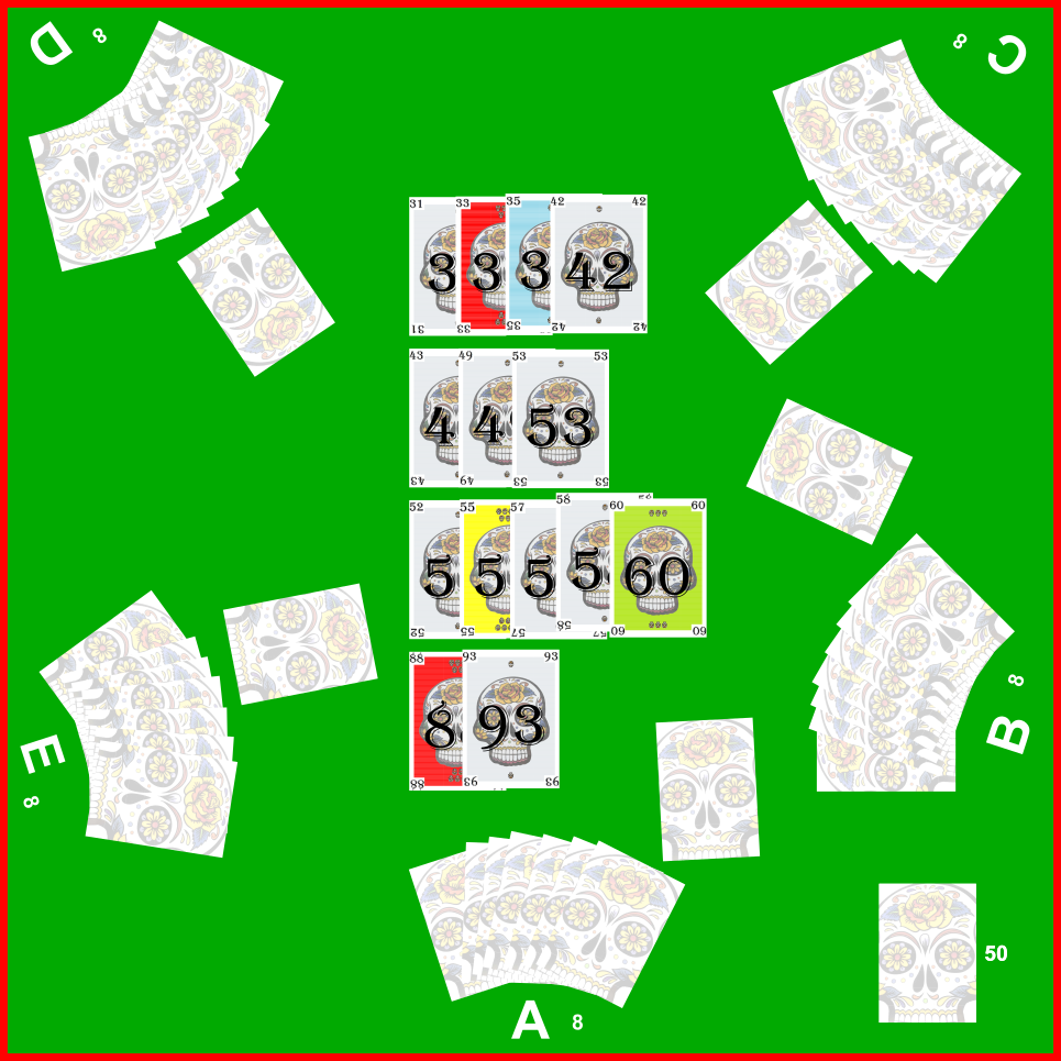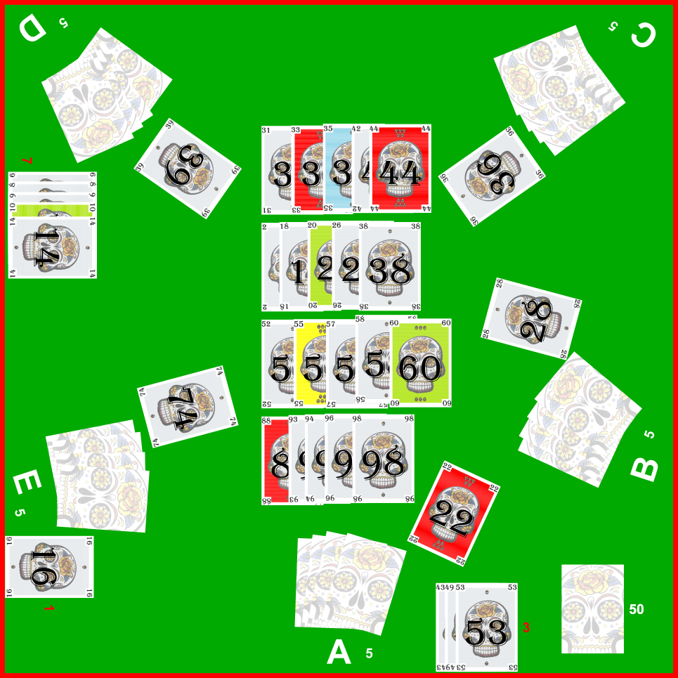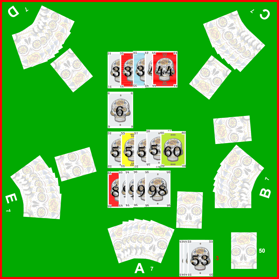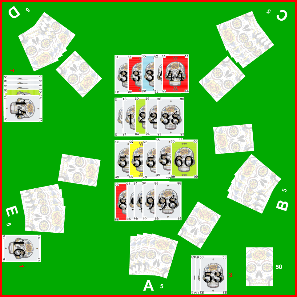 | Jokalariek aukeratutako kartak ahoz gora jarri dituzte: C (42) jokalaria hasiko da; ondoren, E (53), D (57), A (58) eta B (60) jokalariek jarriko dituzte beraienak. (A-0, B-0, C-0, D-0, E-0) | Jokalariek kartak lerroetan jarri dituzte eta hirugarren karta aukeratu dute. Hirugarren lerroan 5 karta daude. Horretan hurrengo karta jartzen duenak aurrekoak eramango ditu. | Jokalariek aukeratutako kartak ahoz gora jarri dituzte: A (6) jokalaria hasiko da; ondoren, D (44), C (94), E (96) eta B (98) jokalariek jarriko dituzte beraienak. |