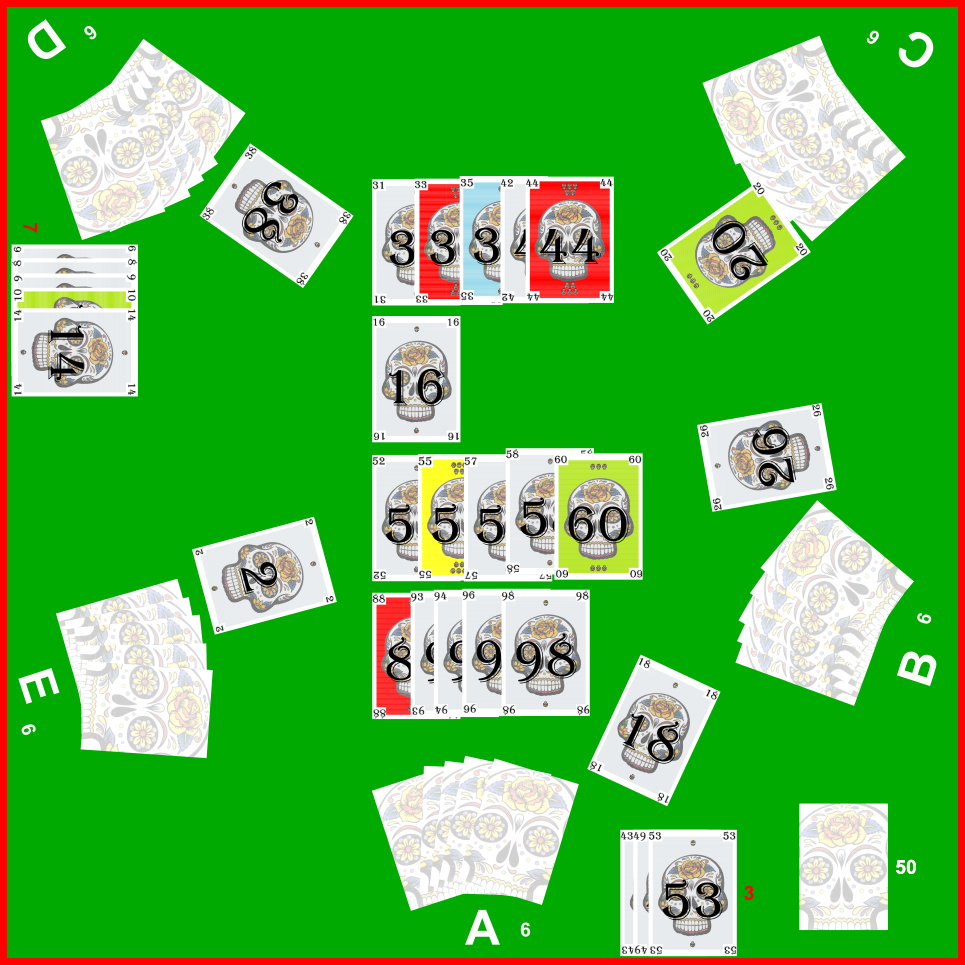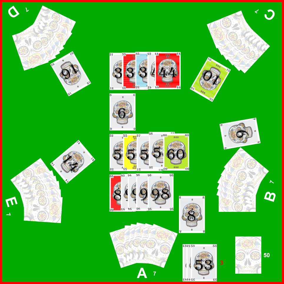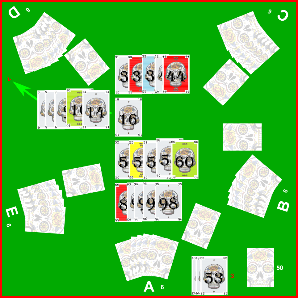 | A jokalariak bigarren lerroko kartak (3 burezur) hartu ditu eta horien ordez bere karta (6) jarri du, lerroetako azken kartak baino txikiagoa zelako. Ondoren, laugarren karta aukeratu dute. Hirugarren eta laugarren lerroetan 5 karta daude. Horietan hurrengo kartak jartzen dituztenek aurrekoak eramango dituzte. (A-3, B-0, C-0, D-0, E-0) | Jokalariek aukeratutako kartak ahoz gora jarri dituzte: A (8) jokalaria hasiko da; ondoren, B (9), C (10), E (14) eta D (16) jokalariek jarriko dituzte beraienak. | D jokalariaren karta (16) bigarren lerroko seigarren karta da; beraz, aurreko guztiak eraman ditu (7 burezur). Ondoren, bosgarren karta aukeratu dute. (A-3, B-0, C-0, D-7, E-0) |