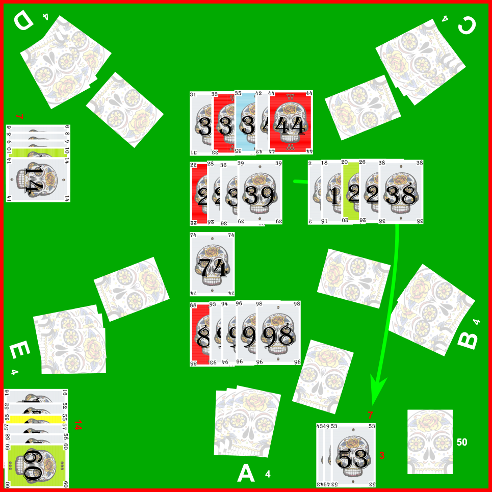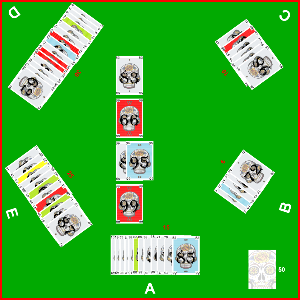 | Jokalariek aukeratutako kartak ahoz gora jarri dituzte: E (2) jokalaria hasiko da; ondoren, A (18), C (20), B (26) eta D (38) jokalariek jarriko dituzte beraienak. | E jokalariak bigarren lerroko karta (burezur 1) hartu du eta horren ordez bere karta (2) jarri du, lerroetako azken kartak baino txikiagoa zelako. Ondoren, seigarren karta aukeratu dute. Lau lerroetan 5 karta daude, beteta daude. Horietan hurrengo kartak jartzen dituztenek aurrekoak eramango dituzte. (A-3, B-0, C-0, D-7, E-1) | Jokalariek aukeratutako kartak ahoz gora jarri dituzte: A (22) jokalaria hasiko da; ondoren, B (28), C (36), D (39) eta E (74) jokalariek jarriko dituzte beraienak. |