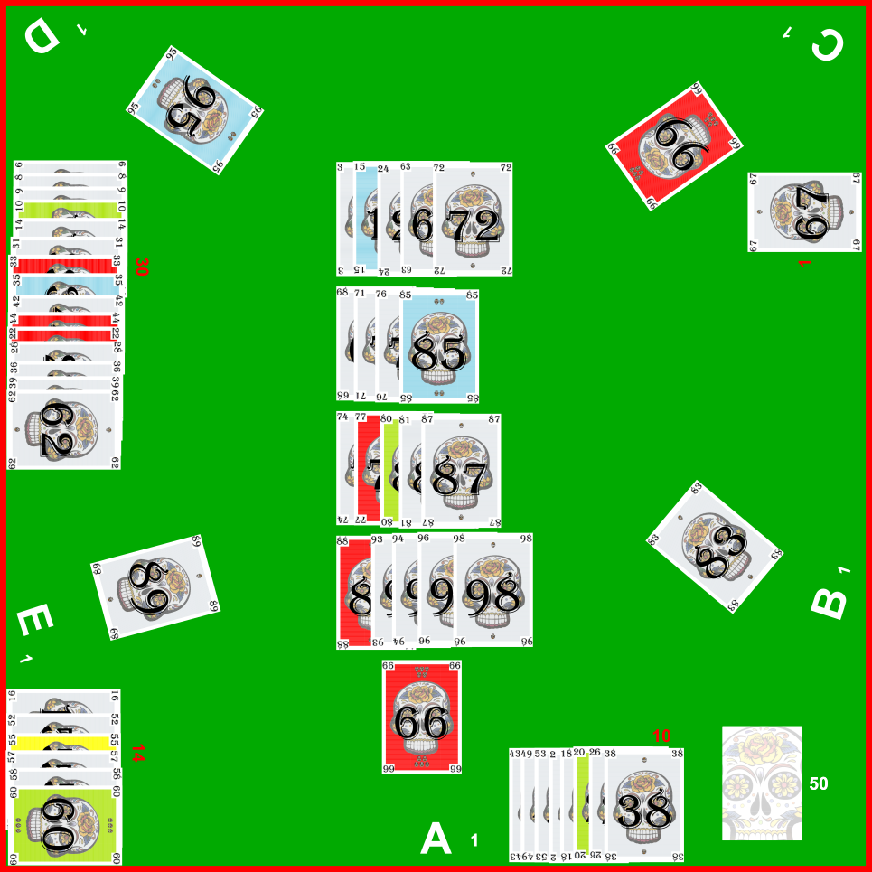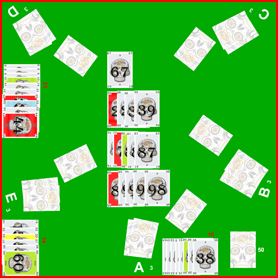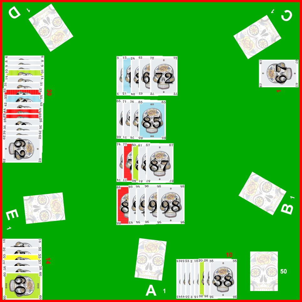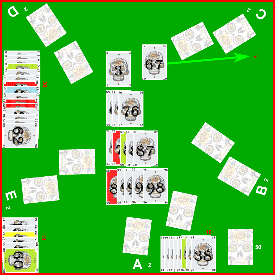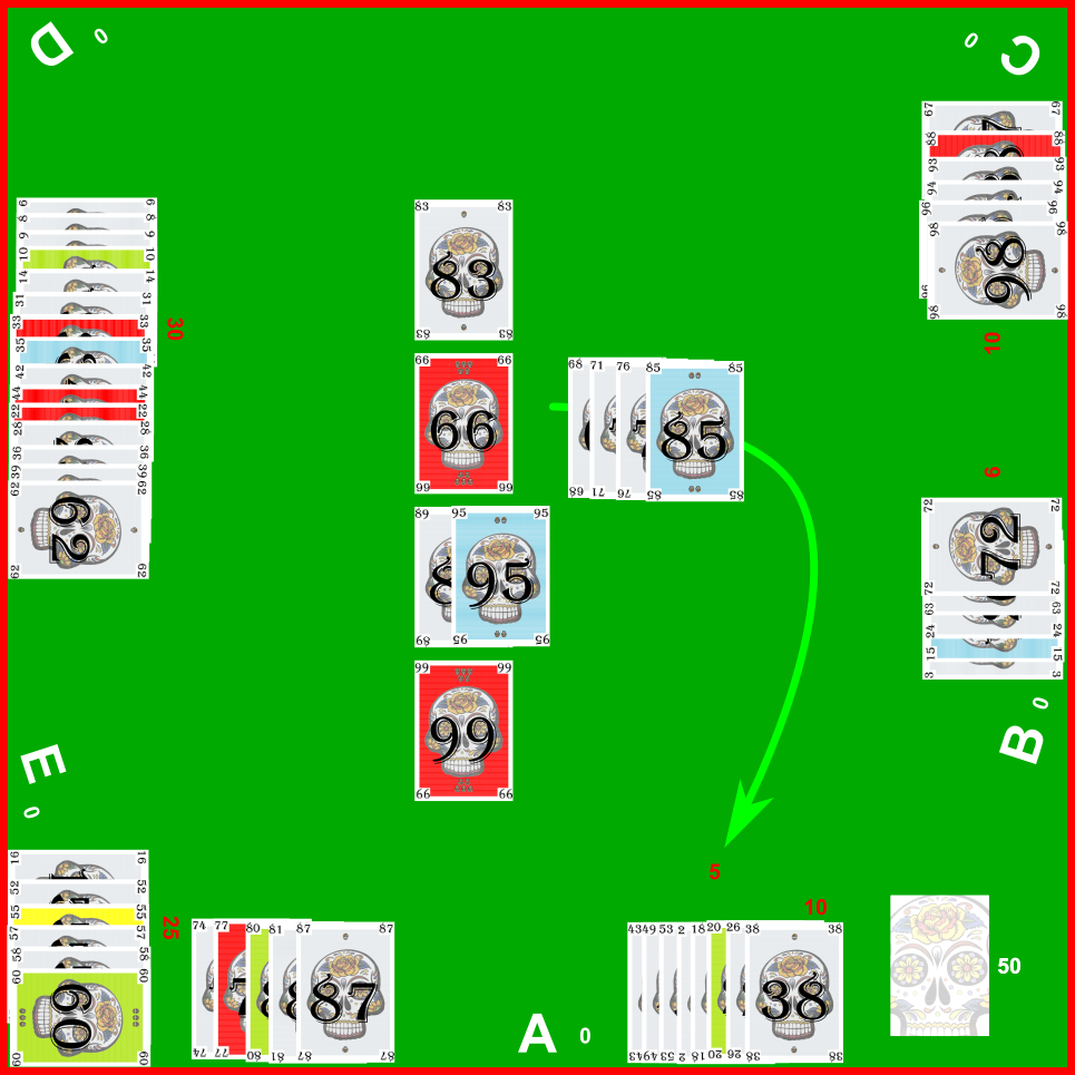 | A jokalariak bigarren lerroko kartak (7 burezur) hartu ditu eta horien ordez bere karta (22) jarri du, lerroetako azken kartak baino txikiagoa zelako. E jokalariaren karta (74) hirugarren lerroko seigarren karta da; beraz, aurreko guztiak eraman ditu (13 burezur). Ondoren, zazpigarren karta aukeratu dute. Lehenengo eta laugarren lerroetan 5 karta daude. Horietan hurrengo kartak jartzen dituztenek aurrekoak eramango dituzte. (A-10, B-0, C-0, D-7, E-14) | Jokalariek aukeratutako kartak ahoz gora jarri dituzte: D (67) jokalaria hasiko da; ondoren, E (77), B (80), C (81) eta A (87) jokalariek jarriko dituzte beraienak. | D jokalariaren karta (67) lehenengo lerroko seigarren karta da; beraz, aurreko guztiak eraman ditu (14 burezur). Ondoren, zortzigarren karta aukeratu dute. Hirugarren eta laugarren lerroetan 5 karta daude. Horietan hurrengo kartak jartzen dituztenek aurrekoak eramango dituzte. (A-10, B-0, C-0, D-21, E-14) |