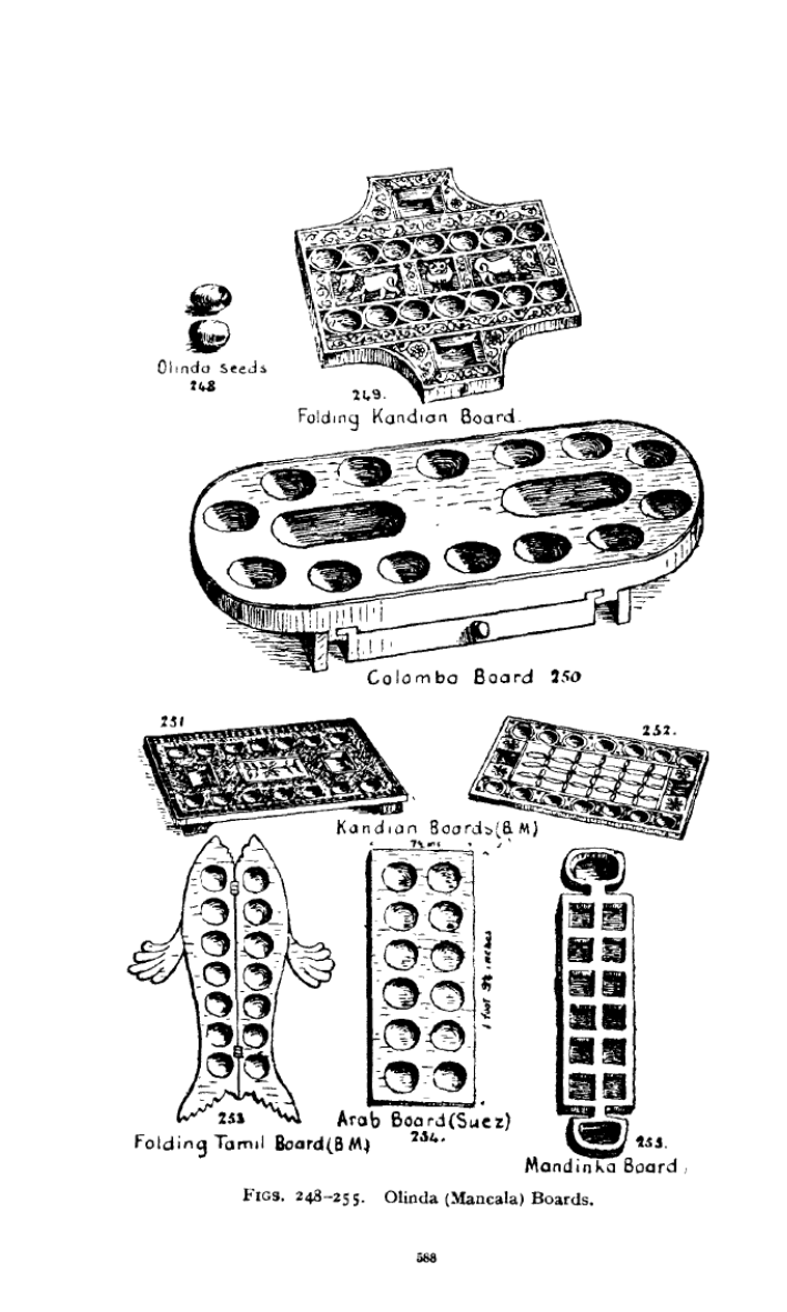 Bere antzinatasuna, Sri Lankan, berarentzat ebakitako zuloen kopuruen aldakuntzek frogatzen dute. Pallebedda-n 2×9 zuloko taula dago, zulo bakoitza 3,8 cm-ko diametrokoa da, eta beste bat handiagoa mutur batean, harrapatutako haziak biltzeko. Gaimediyagala izeneko haitz maldatsu handian zuloak 2×6 eta 2×7 dira; orain 2,54 cm-ko zabalera eta 3,18 cm-ko sakonera baino ez dute, baina arrokaren higadurak agian lehen ebaketan baino sakonera txikiagokoak bihurtu ditu. Gune honetan ez daude bost zulo-multzo baino gutxiago elkarren ondoan. Horrela, agerian geratzen da, lehen garaietan, zulo kopurua aldakorra zela Sri Lankan, baina, Parkerren garaian, han eta Indiako hegoaldean erabiltzen ziren taulek 14 zulo zituzten beti.