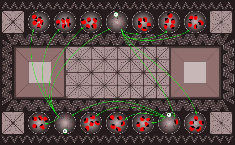 | A jokalariaren lehenengo mugimendua: A1 zuloko 4 haziak hartu eta erein ditu; ondoren, A2ko 5 haziak hartu eta erein ditu; azkenik, A3ko 5 haziak hartu eta erein ditu; azken hazia zulo huts batean erein duenez, txanda bukatu du. | B jokalariaren lehenengo mugimendua: B4 zuloko 4 haziak hartu eta erein ditu; ondoren, B5eko 6 haziak hartu eta erein ditu; ondoren, B6ko 6 haziak hartu eta erein beharko ditu, eta horrela segitu txanda bukatu arte. |