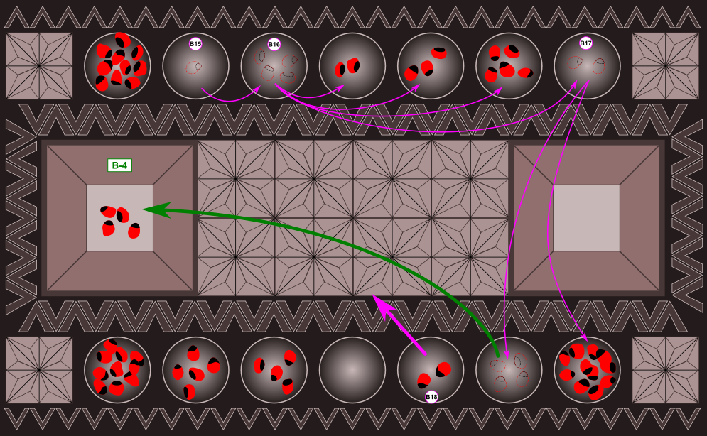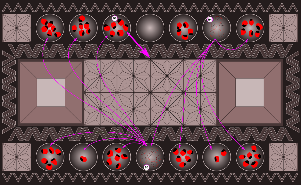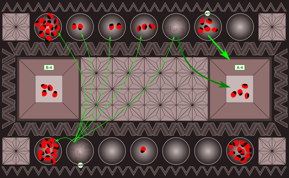 | B jokalariak B15 zuloko hazia hartu eta erein du; ondoren, B16ko 4 haziak hartu eta erein ditu; ondoren, B17ko 2 haziak hartu eta erein ditu. Azken hazia erein duen zuloan 3 hazi zeuden eta azken hazia erein du, lau eginez eta lauak harrapatuz. Ondoren, B18ko 2 haziak hartuz eta ereinez segitu beharko du. | A jokalariak A20 zuloko 6 haziak hartu eta erein ditu. Azken hazia erein duen zuloan 3 hazi zeuden eta azken hazia erein du, lau eginez eta lauak harrapatuz. Ondoren, A21eko 5 haziak hartuz eta ereinez segitu beharko du. |