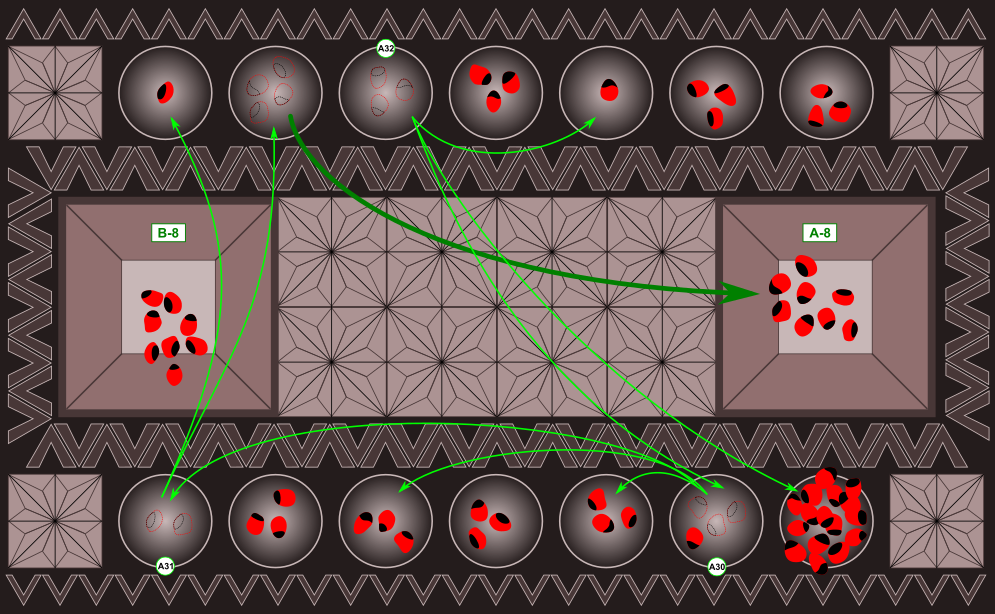 | A jokalariak A30 zuloko 3 haziak hartu eta erein ditu, hiru hazi dituzten zuloetan hazirik erein gabe; ondoren, A31ko 2 haziak hartu eta erein ditu. Azken hazia erein duen zuloan 3 hazi zeuden eta azken hazia erein du, lau eginez eta lauak harrapatuz. Ondoren, A32ko 3 haziak hartu eta erein ditu, hiru hazi dituzten zuloetan hazirik erein gabe. Txanda bukatu zaio. | B jokalariak A68 zuloko hazia hartu eta erein du, zulo hori hazirik gabe utziz. Ondoren, A jokalariak A69ko 2 haziak hartu eta erein ditu, ezin duelako hazi bakarra duen azken zuloa erabili. Ondoren, B jokalariak B70 zuloko hazia hartu eta erein du, zulo hori hutsik utziz. Ondoren, A jokalariak A71ko 2 haziak hartu eta erein ditu, azken hazia hutsik geratu berri den B jokalariaren zuloan utziz. A jokalaria hazirik gabe geratu da bere aldean. Azkenik, B jokalariak B72 zuloko hazia hartu eta erein du, A jokalariari hazirik eman gabe. Lehenengo fasea bukatu da, A jokalariaren txandan hazirik gabe dagoelako. A jokalariak 16 hazi harrapatu ditu, eta B jokalariak 32 hazi gehi zuloetako 8 haziak, guztira 40 hazi. |