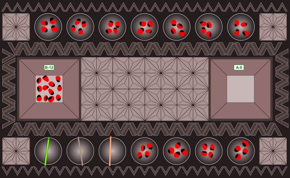 | A jokalariak harrapatutako 16 haziak lau zulotan sartu ditu; beraz, “lau begiko” aldea du. Ezker aldeko hiru zulo “itsuak” adartxo banaz estali ditu. B jokalariak bere zulo guztiak bete ditu eta 12 haziko soberakina utzi du biltegian. Bigarren fasearen hasierako posizioa da. |