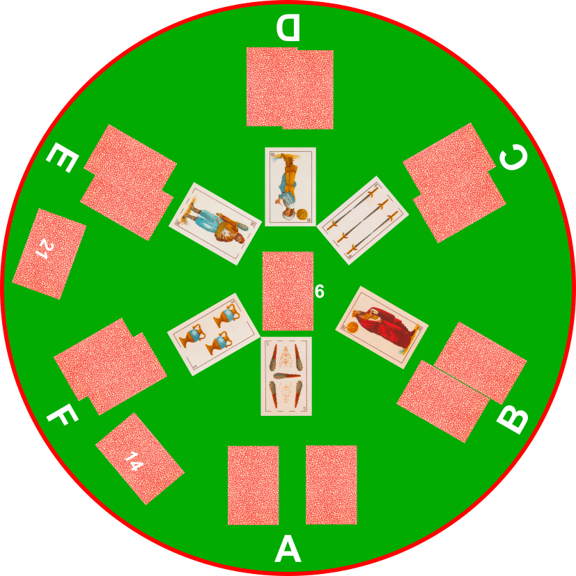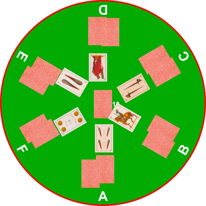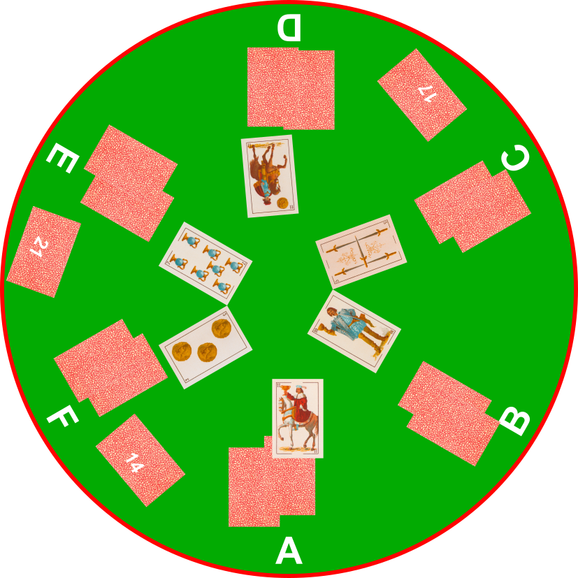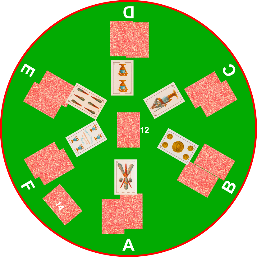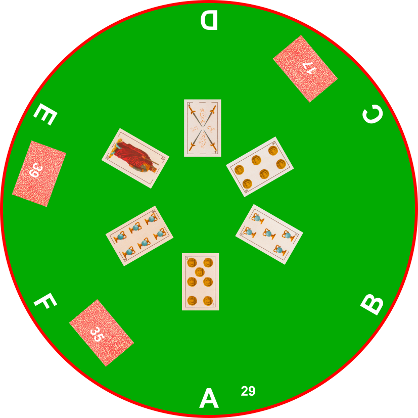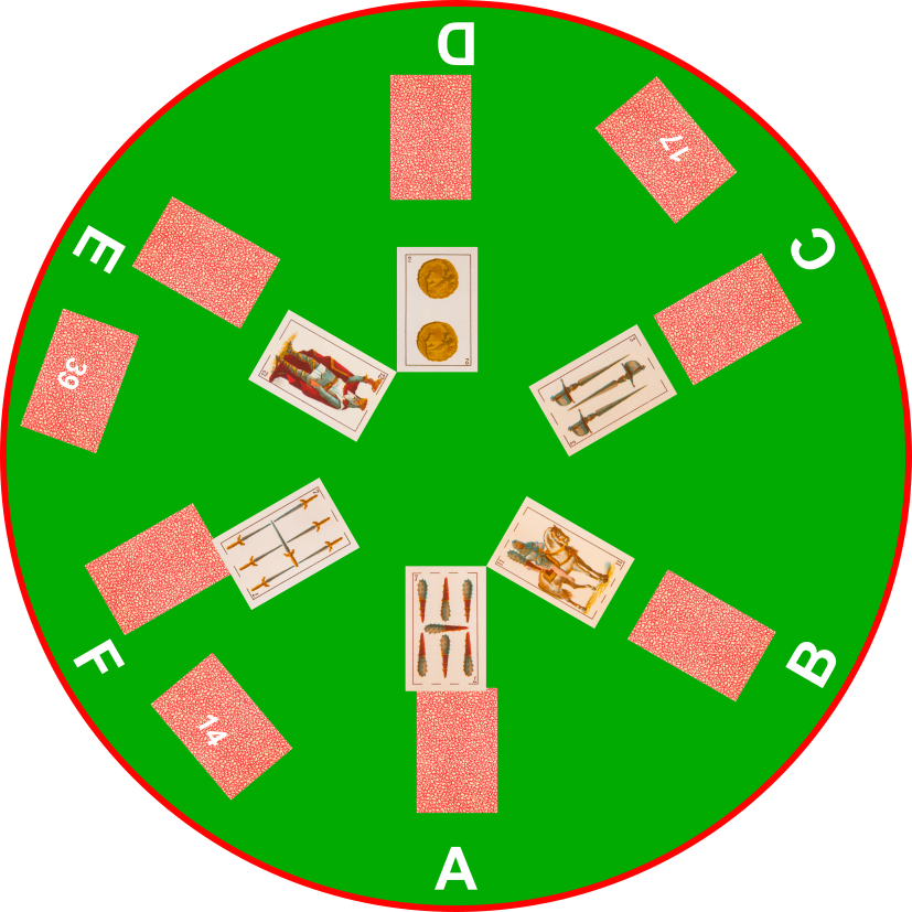 Hasieran lau batekoak kendu ondoren, A jokalariak hiruna karta banatzen dizkie jokalariei. |