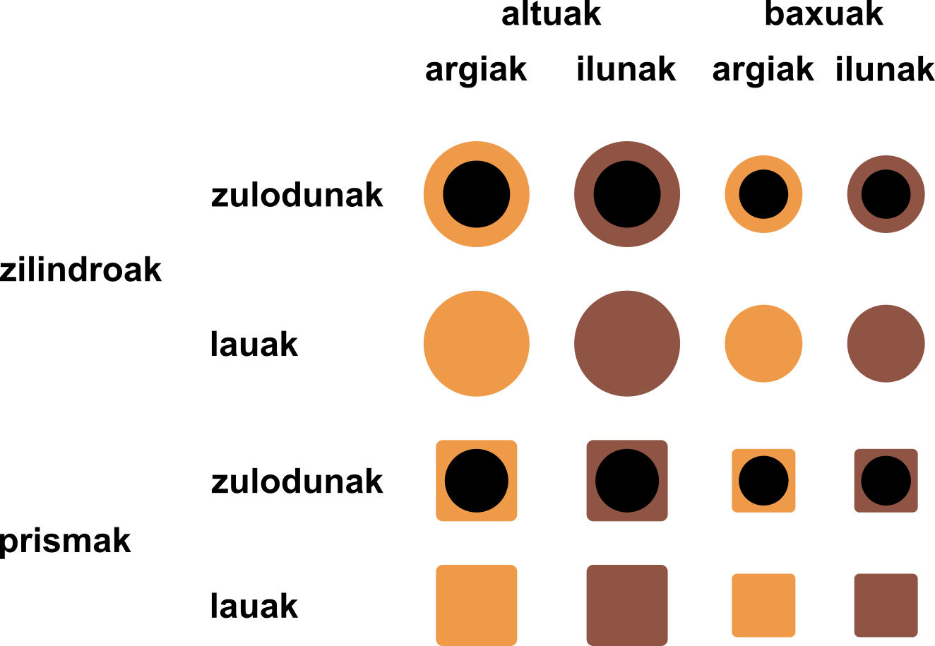 Taulak 16 zirkulu ditu, 4×4 eran kokaturik. 16 pieza desberdin daude, launa ezaugarrirekin: argia/iluna, zilindroa/prisma, altua/baxua eta hutsa/betea.