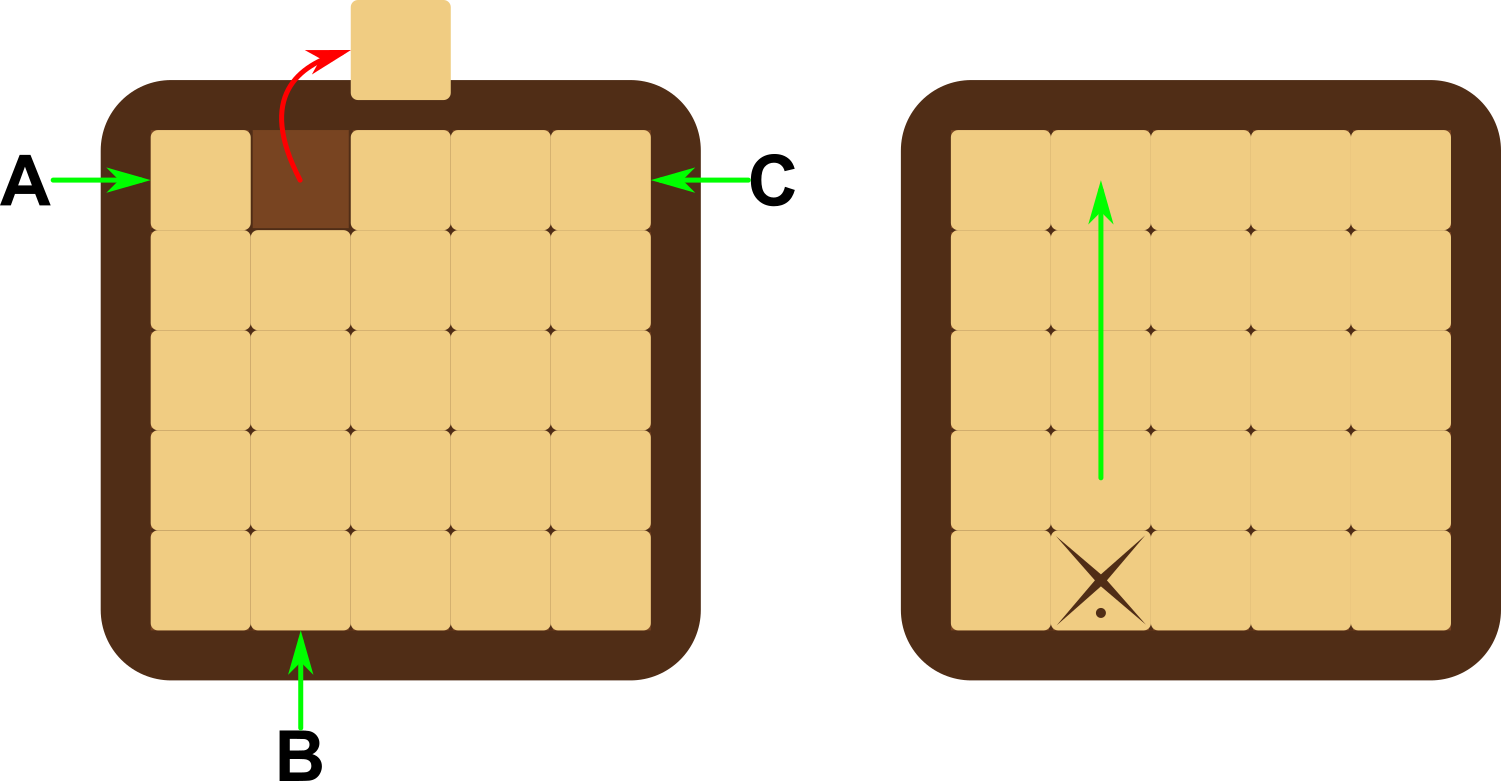 | Ertzeko kuboa kentzean, jokalariak hiru lerro osatugabe utzi ditu, A, B eta C. Eskuinean, B zutabea gora bultzatu du eta marka daraman kuboa jarri du. |