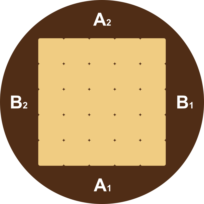 Hogeita bost kuboek aurpegi batean gurutze (eta puntu) bat, beste aurpegi batean zirkulu (eta puntu) bat eta gainerako lau aurpegiak hutsi dituzte.