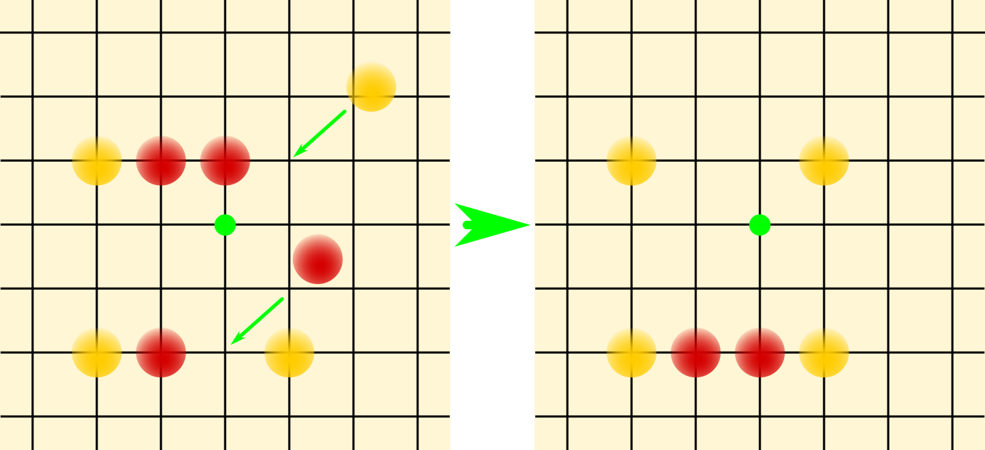 Jokalari baten aurkariak ondoz ondoan bi harri (eta bi bakarrik) dituen bakoitzean, harri horiek zaurgarriak dira harrapatzeko. Bikotea harrapa daiteke bere bi muturrak jokalariaren harriekin tartean hartuz. Adibidez, horiak geziak adierazten duen posizioan jokatzen du, bi harri gorri tartean hartuz. Horrela, bikote gorria harrapatu eta taulatik kentzen da, eskuineko irudian erakusten den bezala utziz (goian irudian).