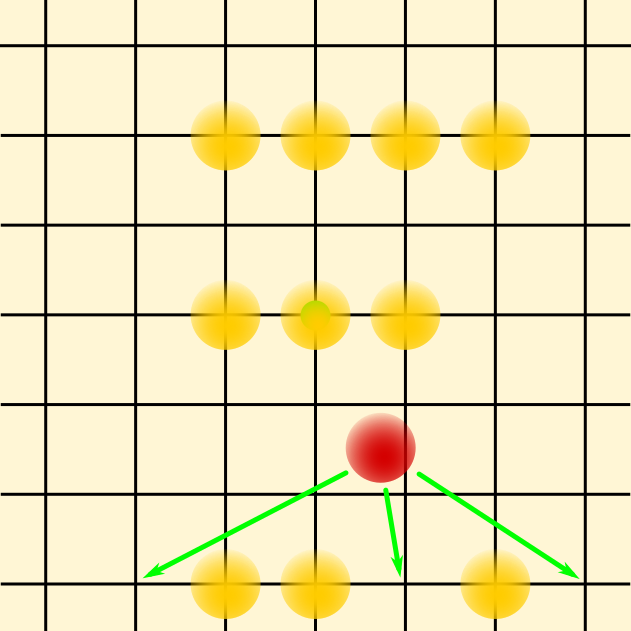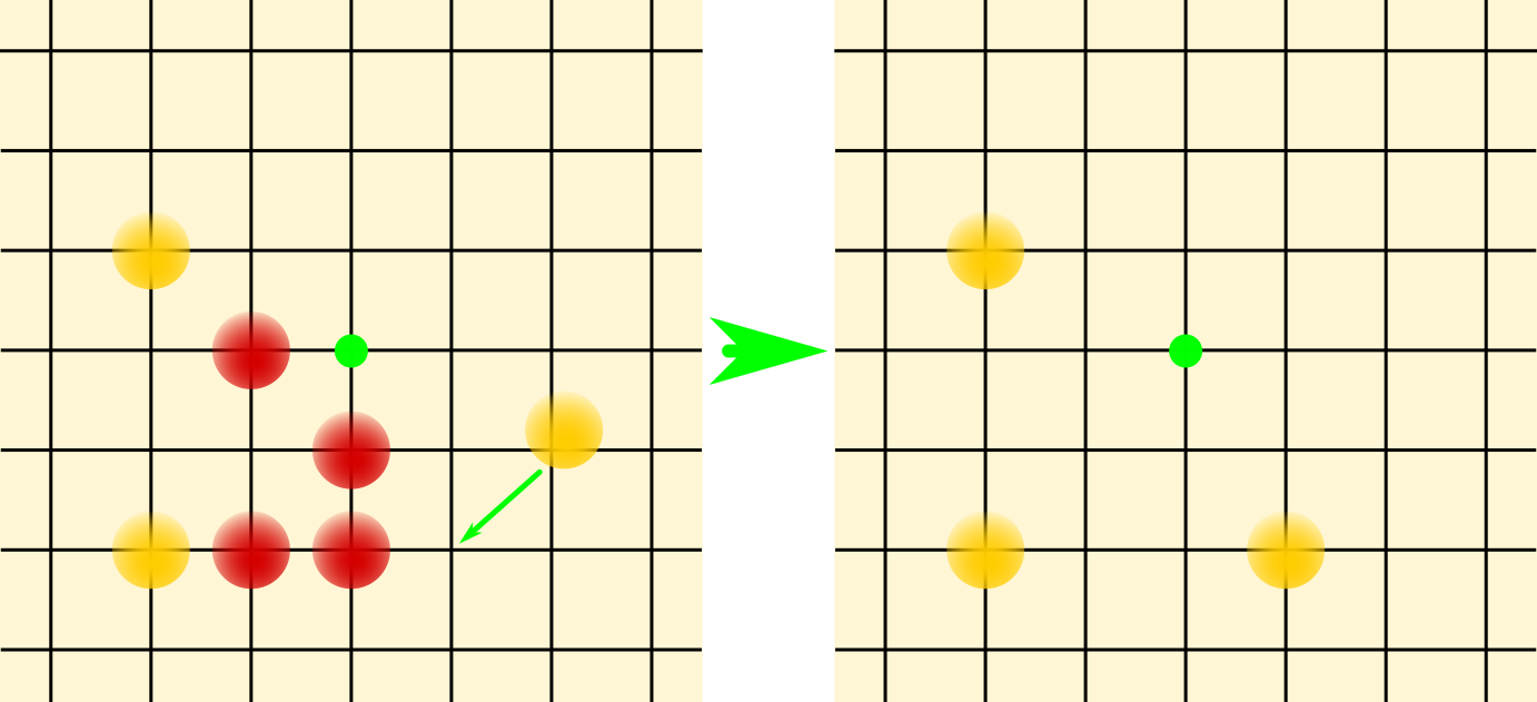 Hustutako posizio batera mugitzen. Harri bat, legez, edozein bidegurutze hutsen gainean jar daiteke, nahiz eta posizio hori aurretik okupatua izan, eta nahiz eta bi harri aurkarien artean bikote bat osatu. Hortaz, irudian, gorriaren mugimendua segurua da eta ez da taulatik harririk kentzen (behean irudian).