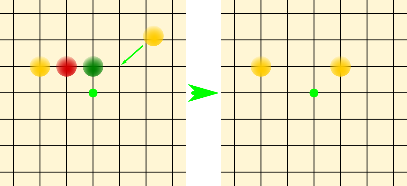 2. harrapaketa mistoak: jokalari batek bi kolore desberdineko harri pare bat harrapatzea ere posible da. Harrapakariek kolore bakarreko harriak izan behar dute. Irudian, horiak harri berde bat eta harri gorri bat harrapatzen ditu.
