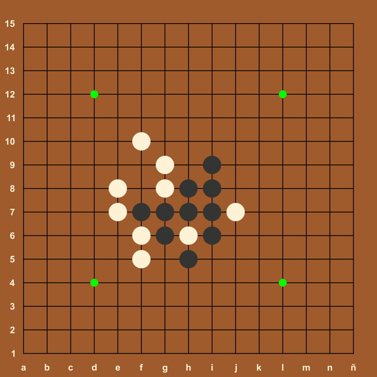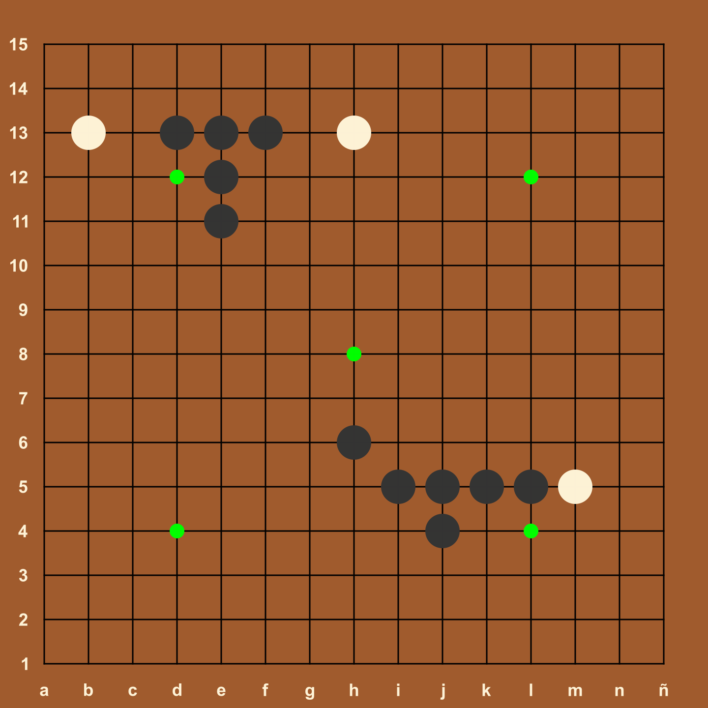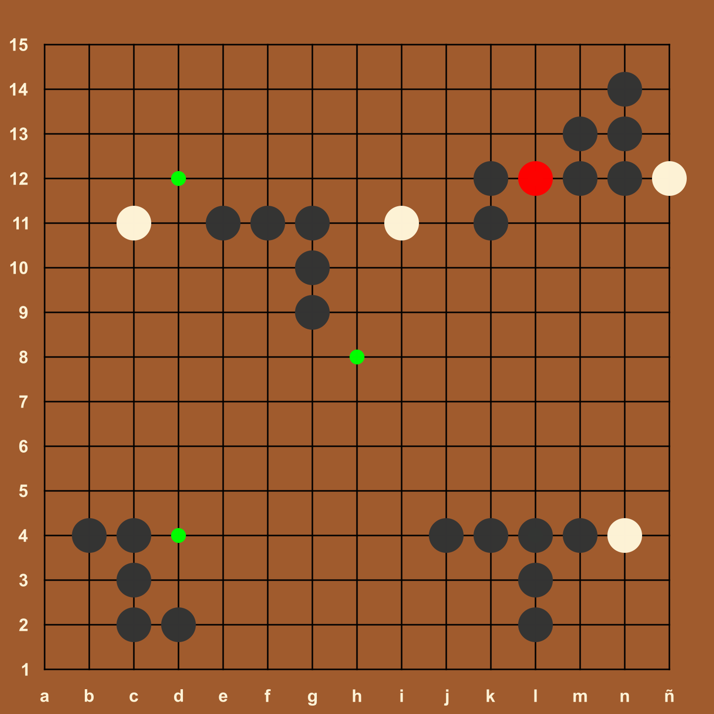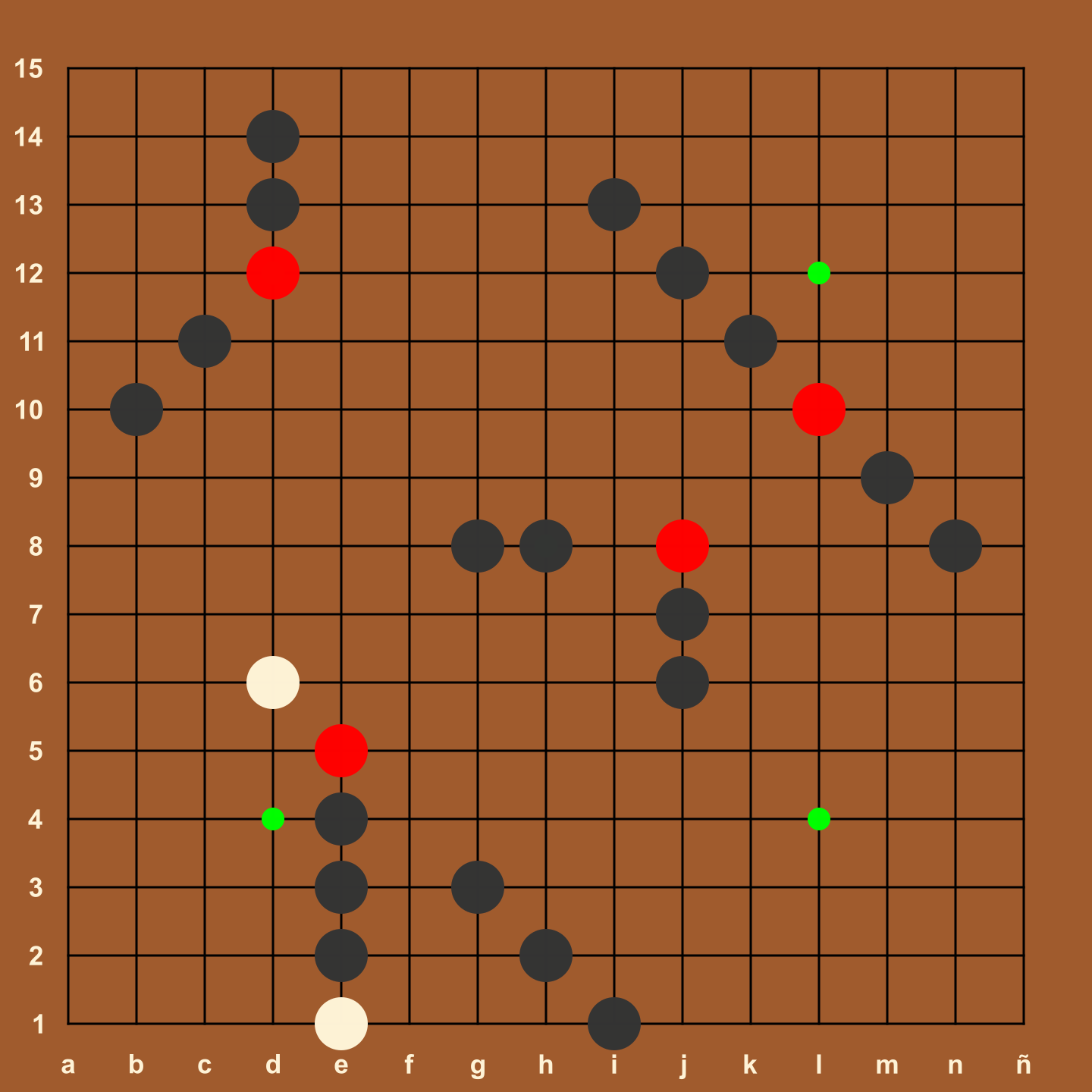 | d12ko eta j8ko harriak jokatzea debekatuta du beltzak hirukote bikoitza egiten duelako. e5eko harria jokatzea debekatuta du beltzak laukote bikoitza egiten duelako. l10eko harria jokatzea debekatuta du beltzak ilara luzea egiten duelako. |