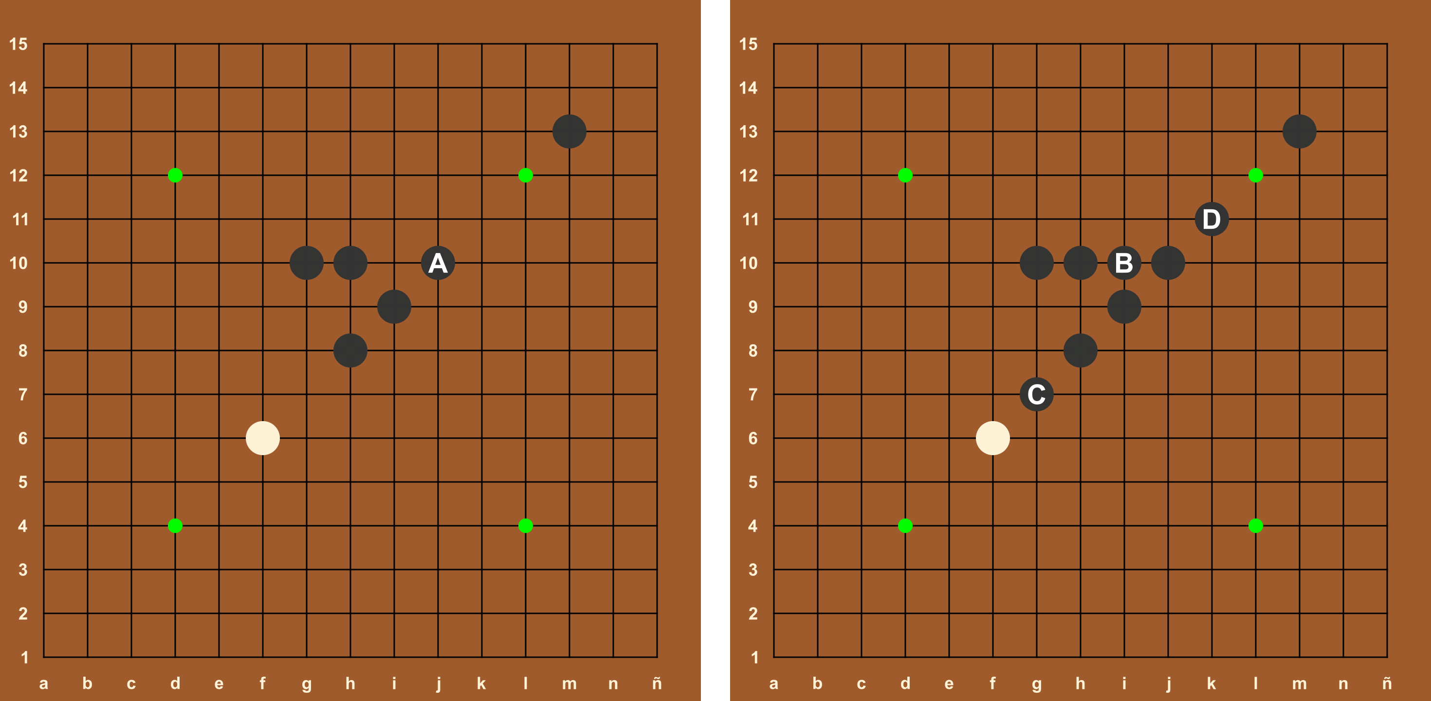 Baina zer gertatzen da diagonal horretako k11 posizioan (D harria) laukotea egiten badugu? Hala ere, ez da laukote ireki bat, beltzak, geroago, bosteko ilara laukotearen beheko muturretik bakarrik egiten duelako, ez bi muturretatik. Nolatan? Izan ere, goiko mugimenduak (m12 posizioan) ilara luzea egingo luke, eta hori beltzen beste debeku bat da renjun; beraz, ezin da horrekin irabazi. Ondorio gisa, hirukote diagonala ezin denez laukote ireki bihurtu (laukote bat, bi muturretatik bosteko ilara irabazlea izan daitekeena), hirukotea bera ez da hirukote irekia. Hirukote diagonala ez denez hirukote ireki bat, ez dago batere hirukote bikoitzik, eta ezkerreko diagramako A harria j10 posizioan jartzea zilegi da.