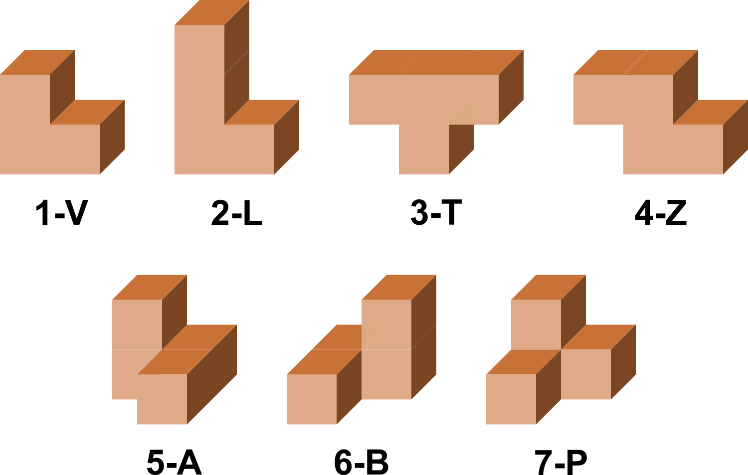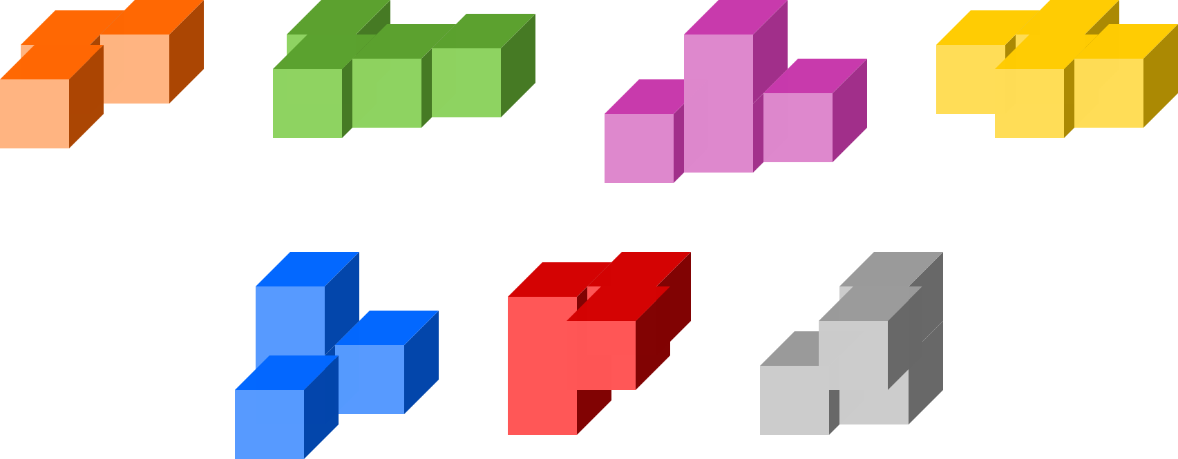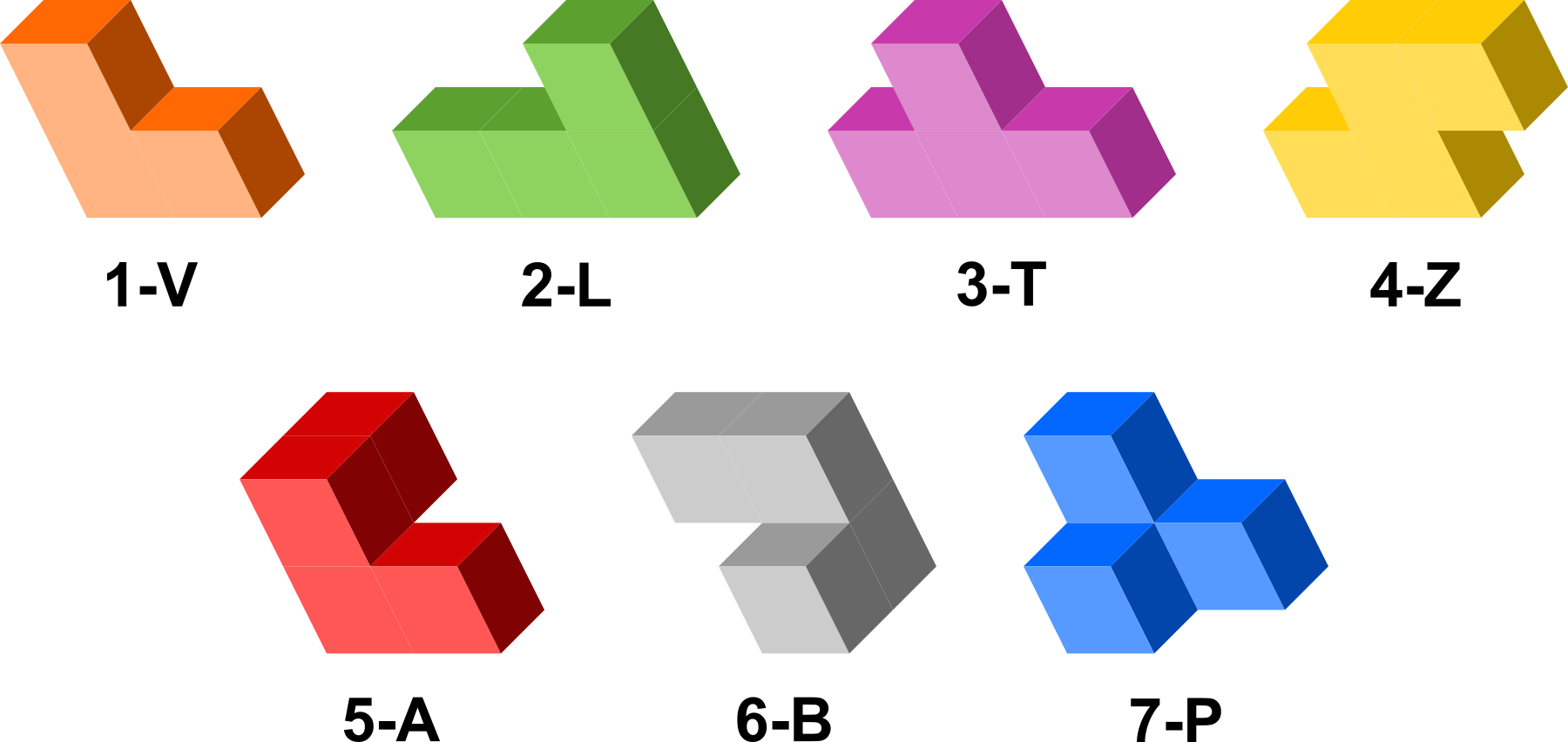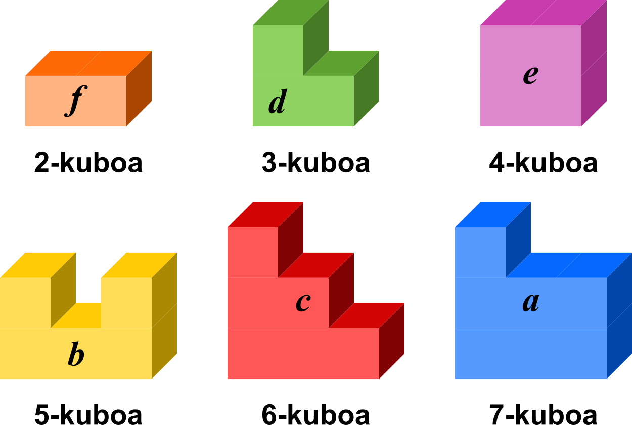 Unitate kubo batetik abiatuta osatutako sei pieza, 3-kubo bat eta sei 4-kubo.