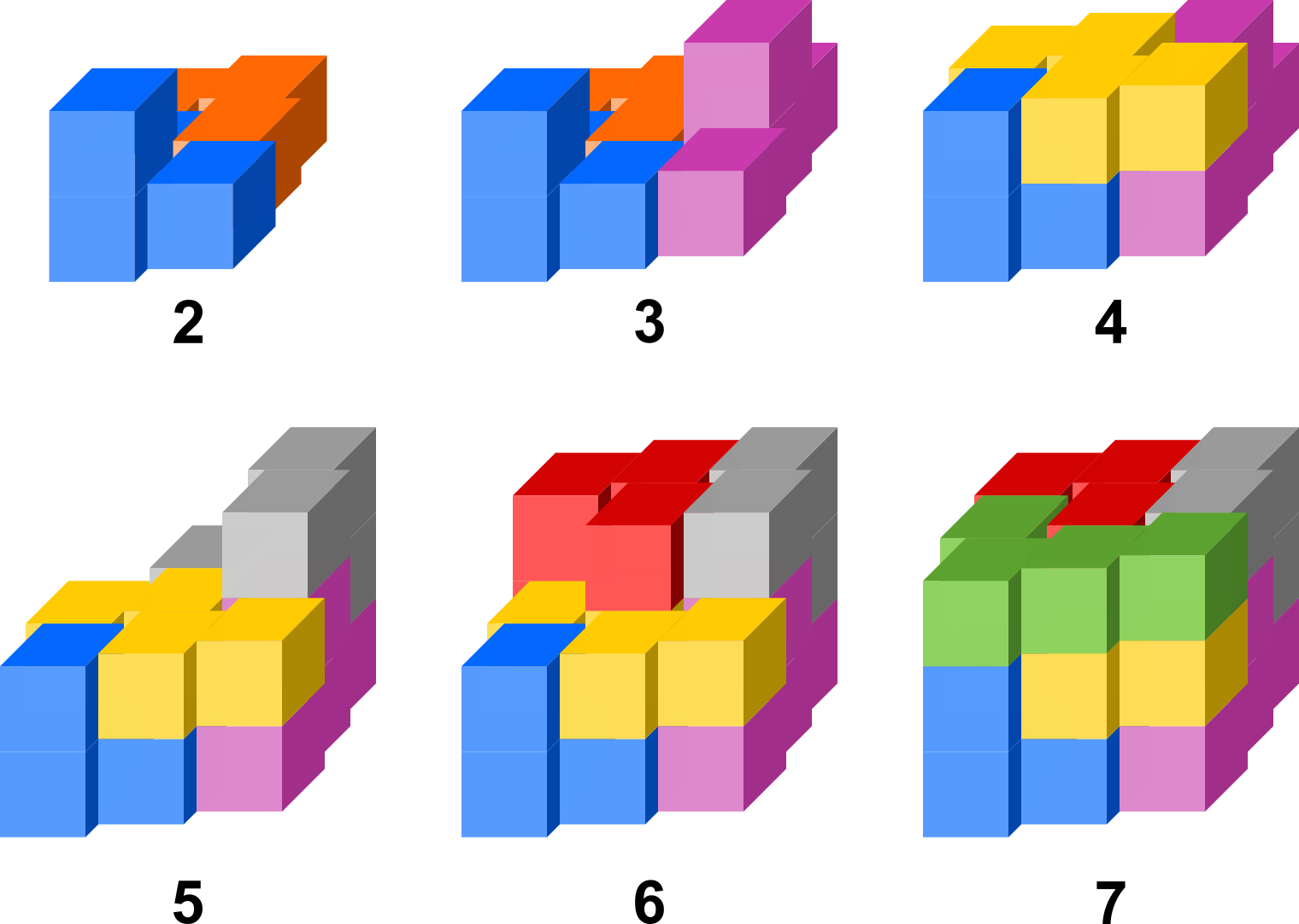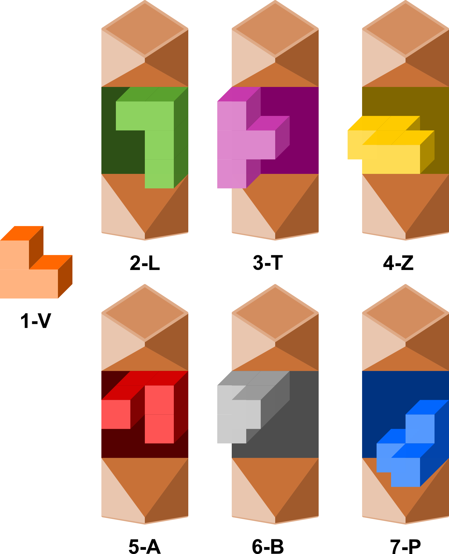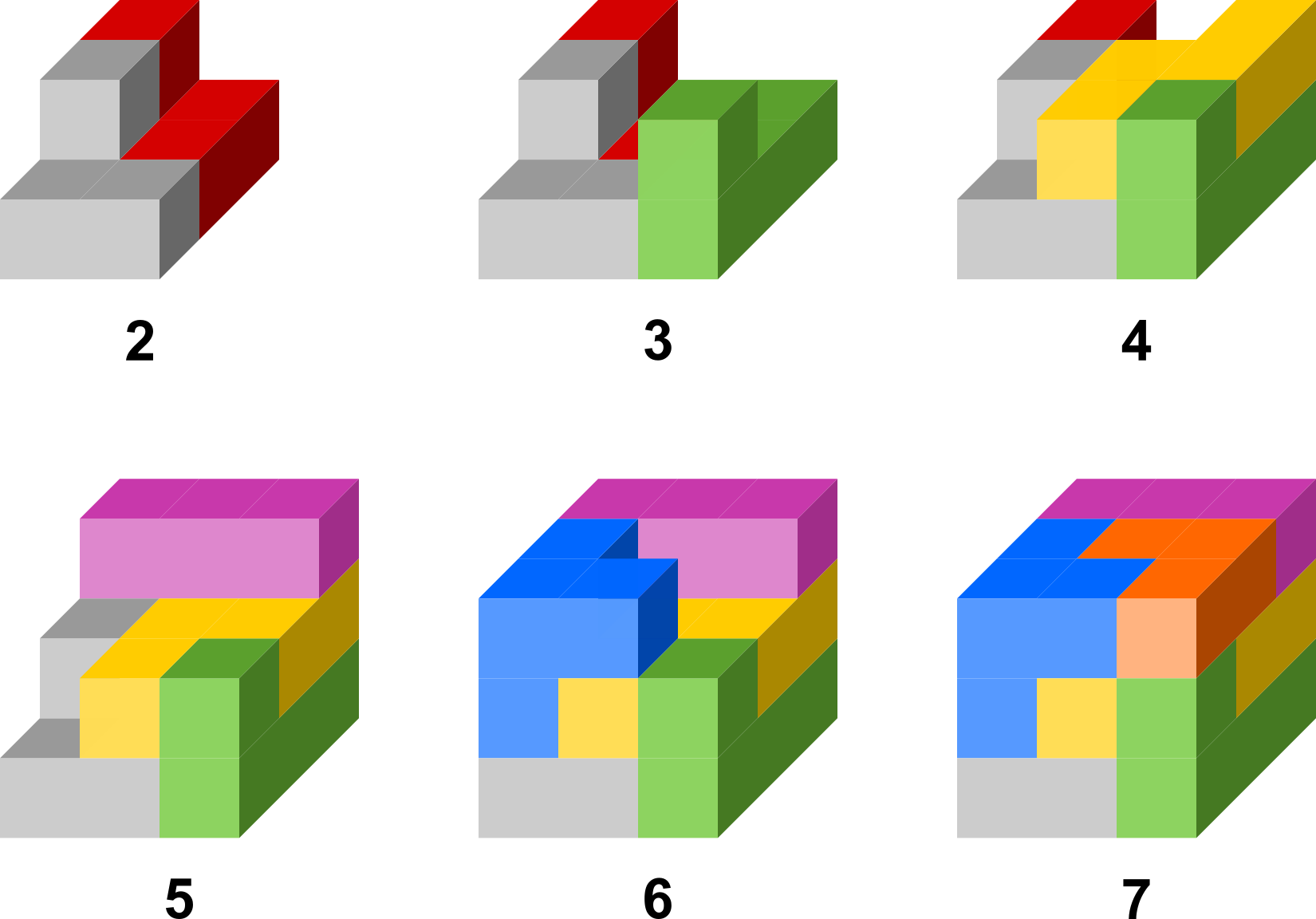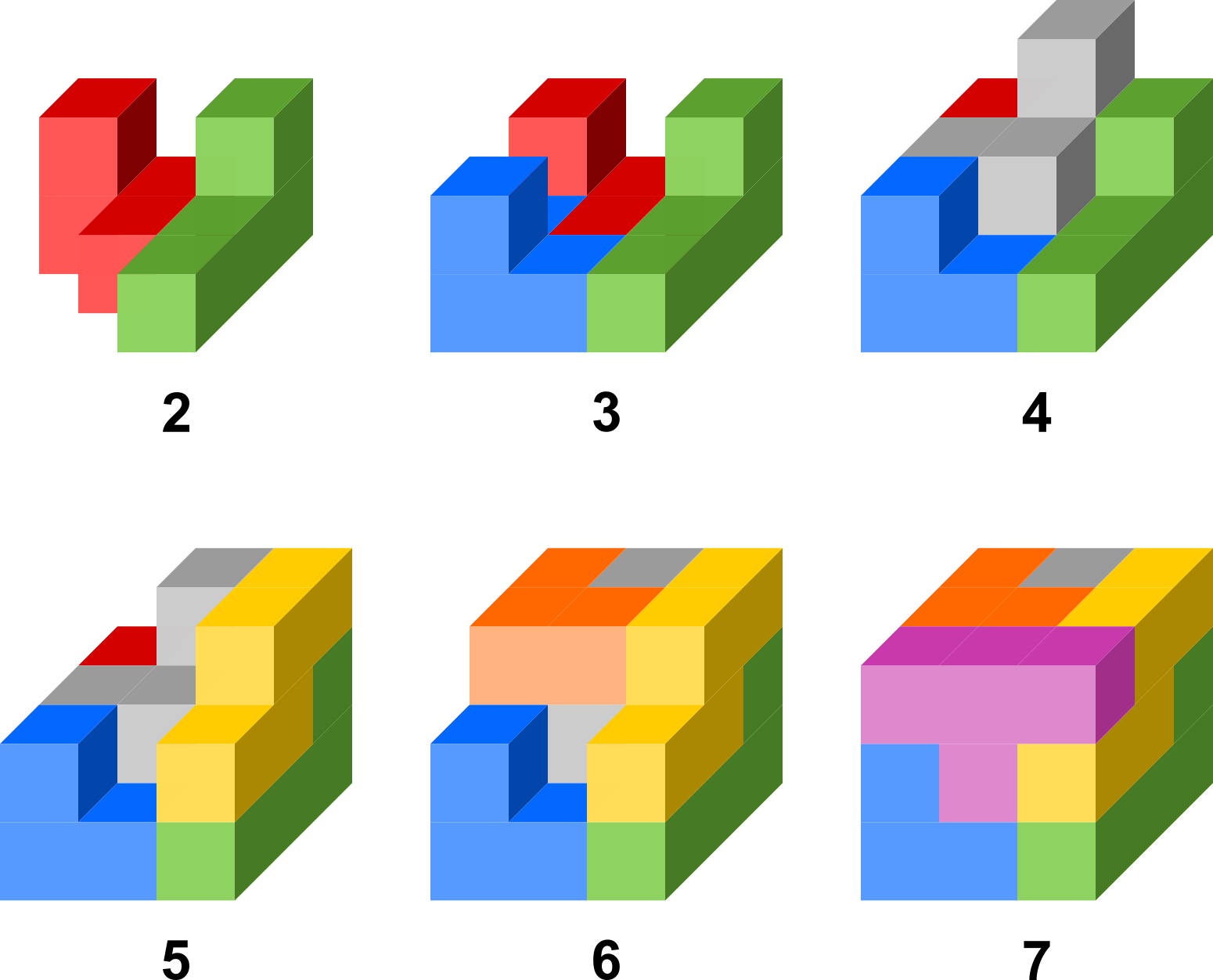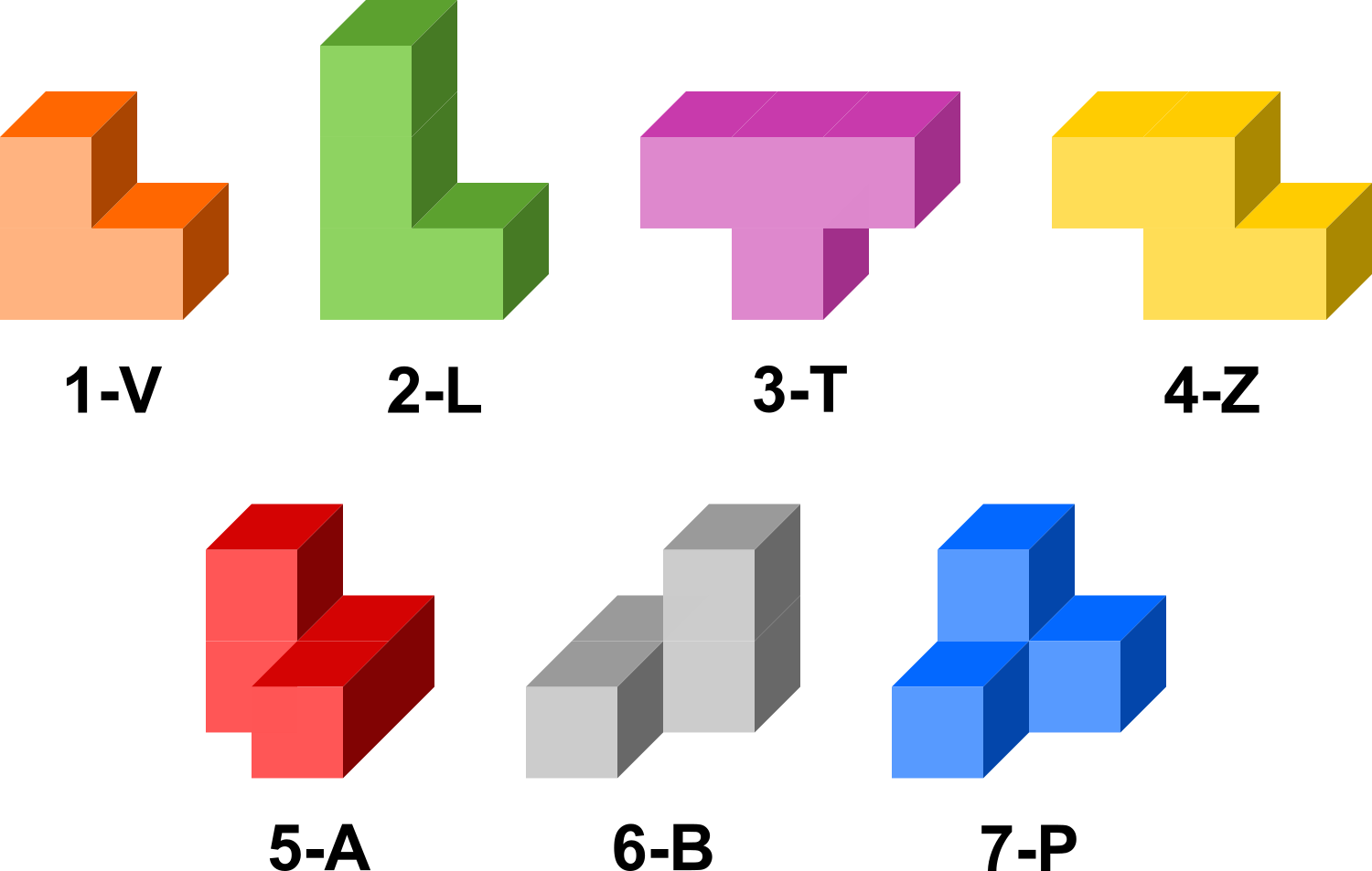 Unitate kubo batetik abiatuta osatutako sei pieza, 3-kubo bat eta sei 4-kubo.