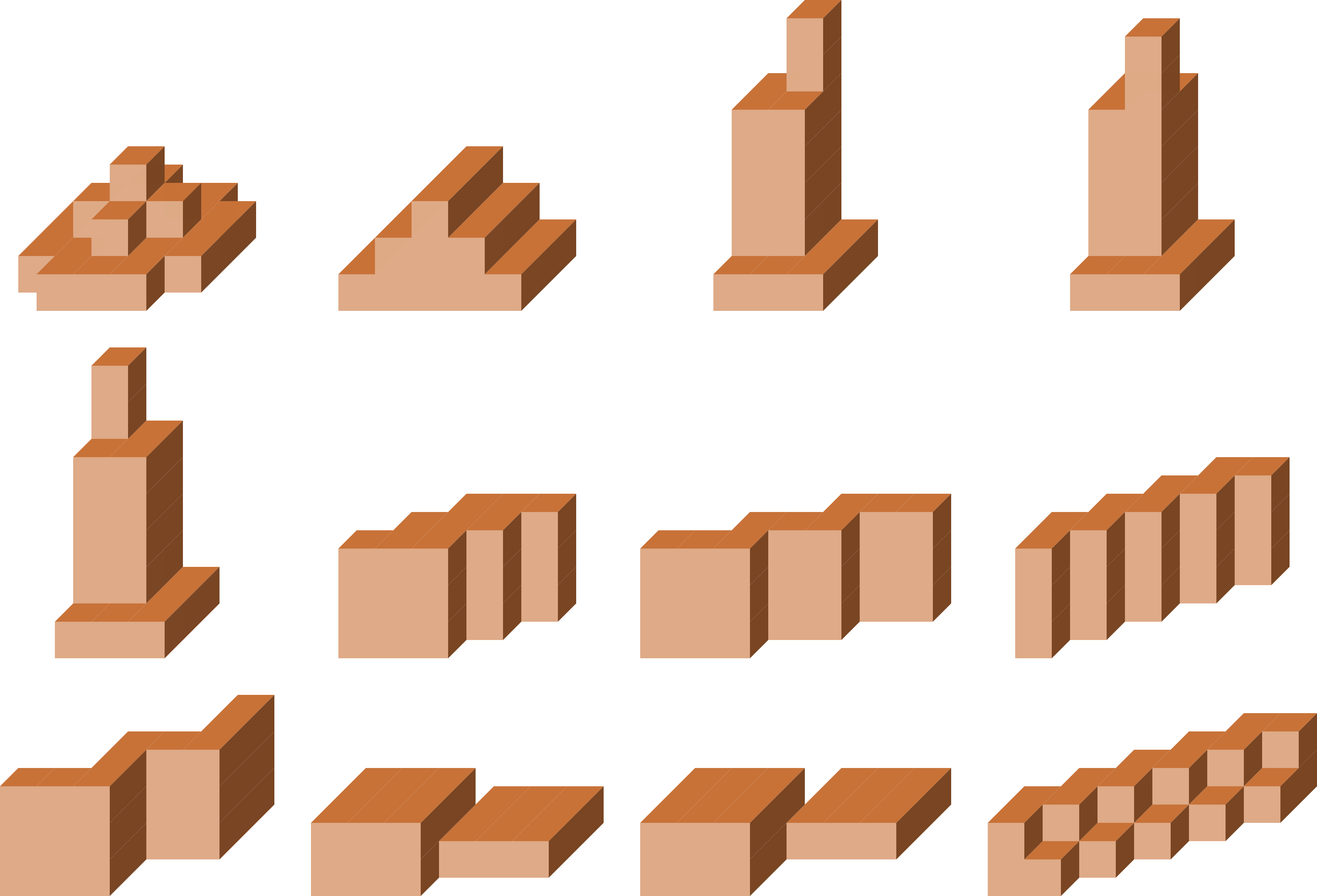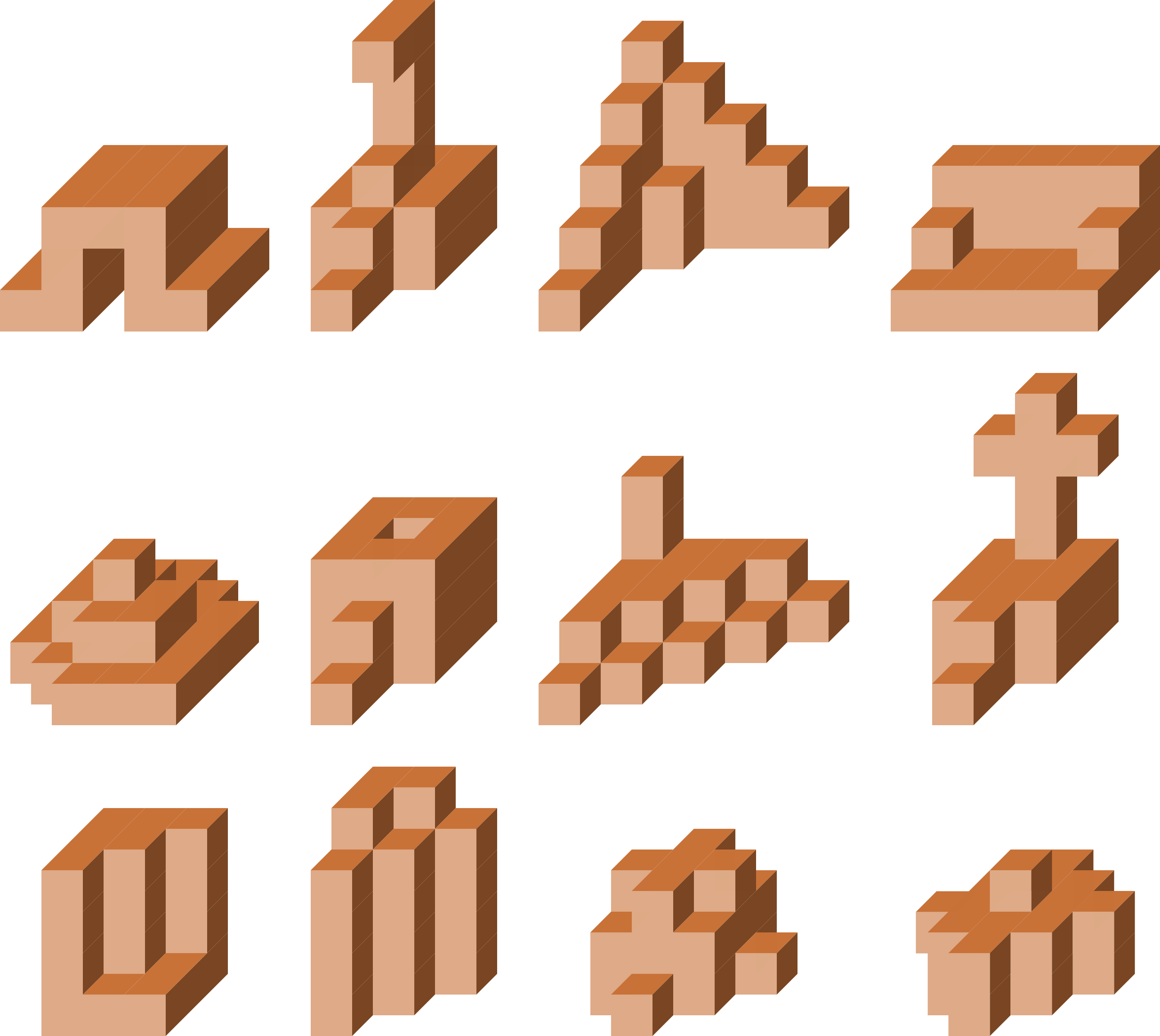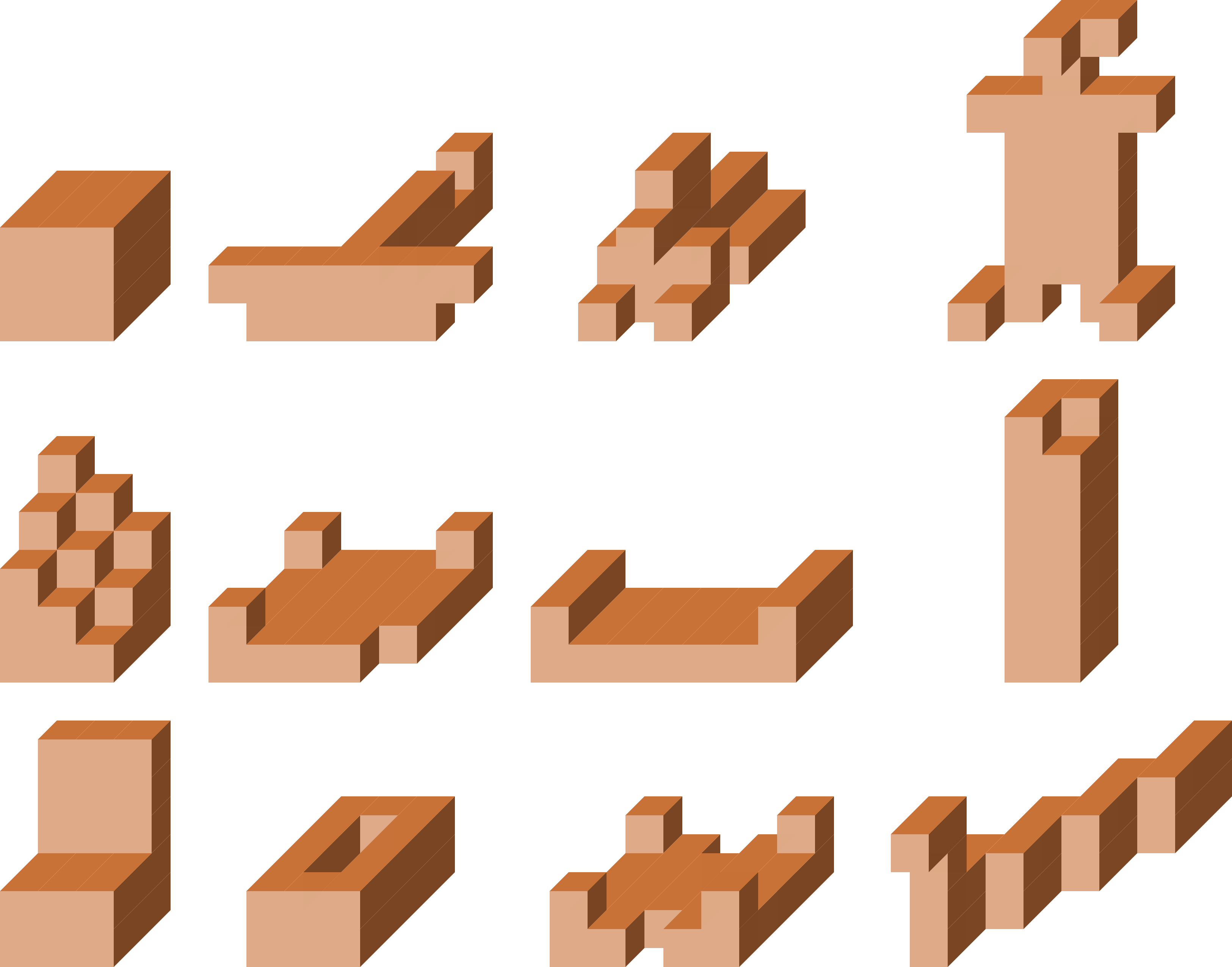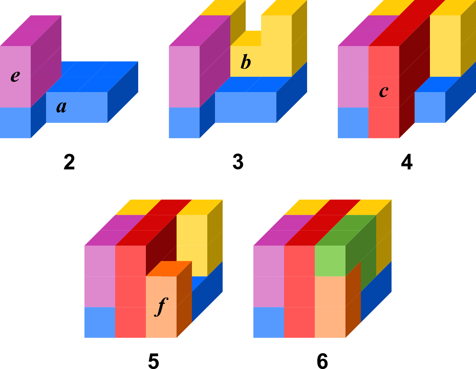 Unitate kubo batetik abiatuta osatutako sei pieza, 3-kubo bat eta sei 4-kubo.