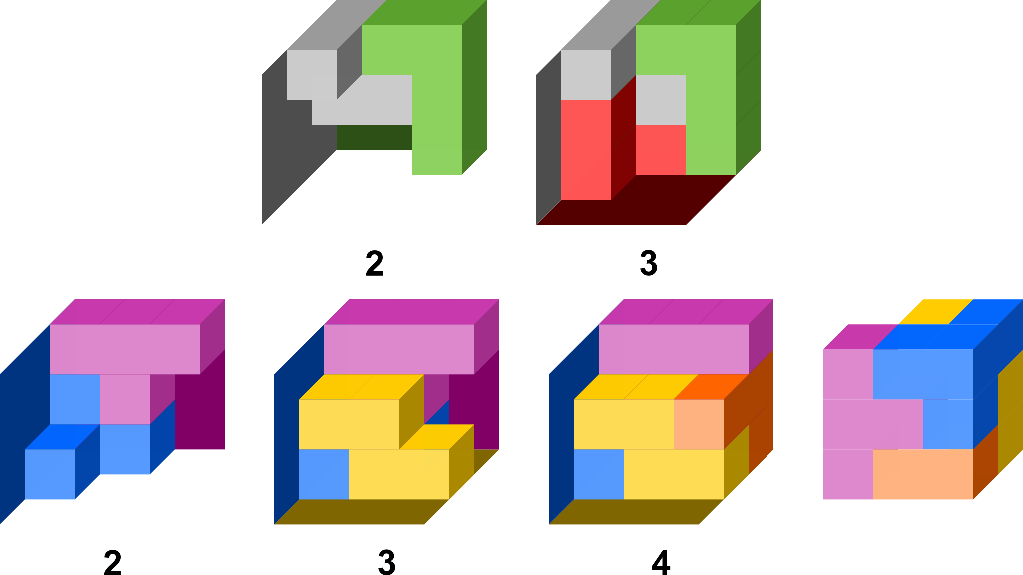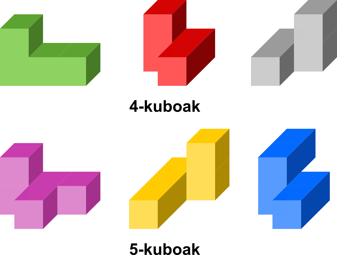 Gehienez lau kubo, guztiak tamaina berekoak eta haien aurpegietan elkartuak, konbinatuz osa daitezkeen pieza irregular guztiak hartzen baditugu pieza horiek konbinatu egin daitezke kubo handiago bat osatzeko.