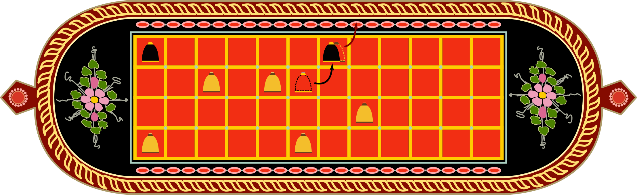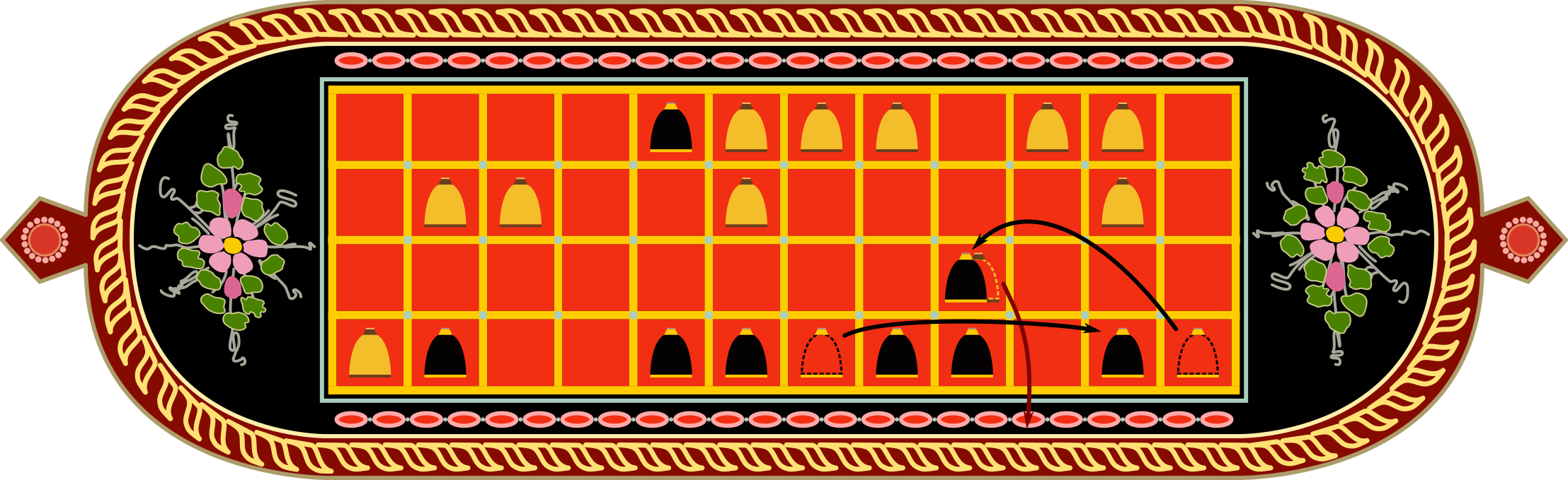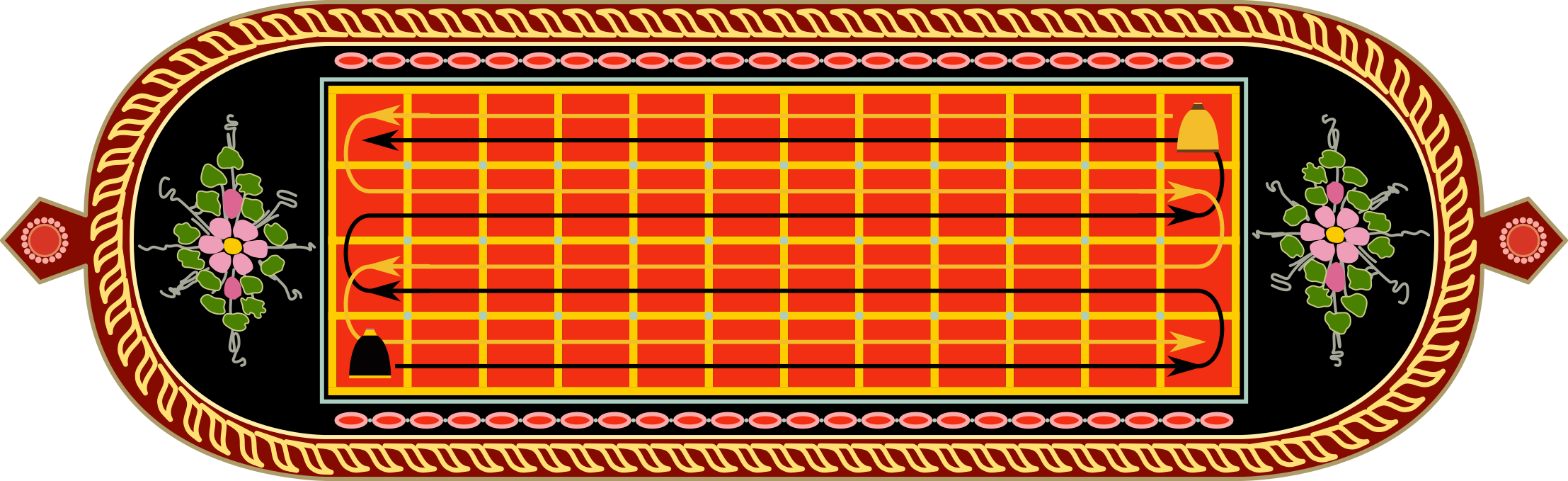 Taula 4×12 laukiko sarea da. Kanpoko bi lerroak jokalarien hasierako lerroak, edo etxeak, dira.