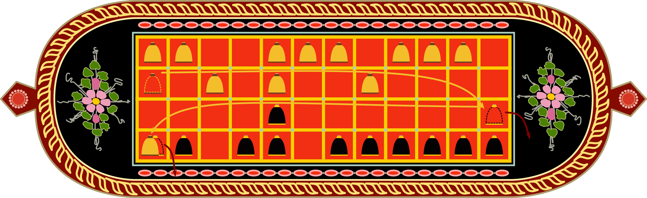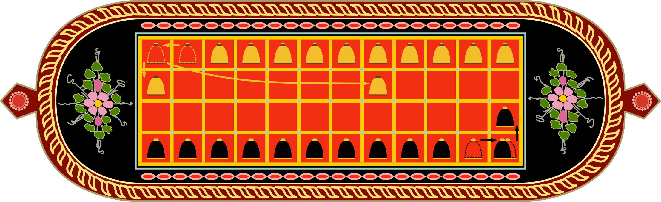 Jokalari bakoitzarentzat, peoien ibilaldia hasierako lerroko ezkerreko laukitik hasiko da eskuinera; ondoren, bigarren lerrora joan eta ezkerrera; ondoren, hirugarren lerrora joan eta eskuinera; azkenik, laugarren lerrora joan eta berriro ezkerrera. Horrek esan nahi du, lerro bakoitzean, bi jokalarien peoiak noranzko berean mugituko direla.