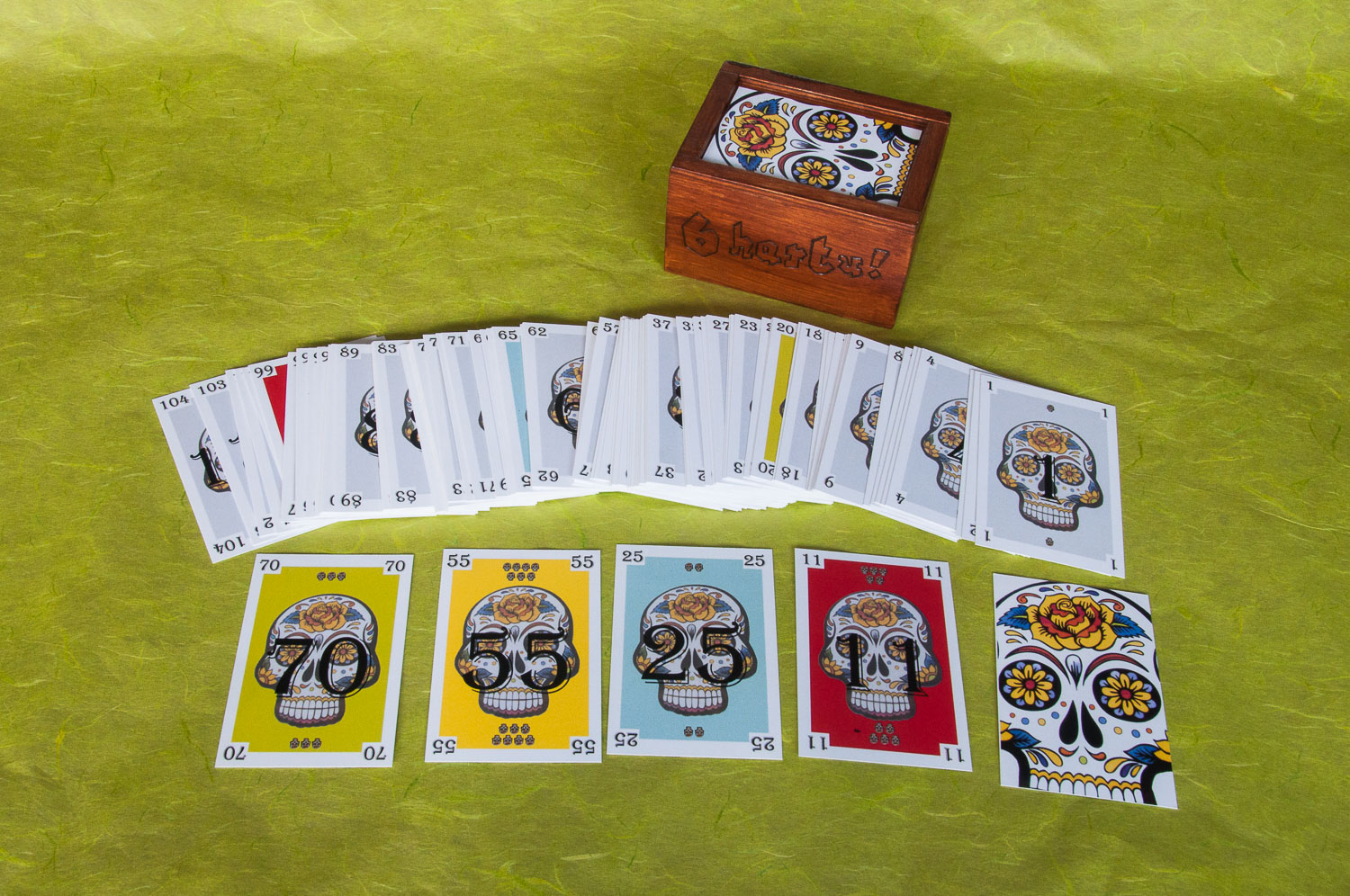 Ehun eta lau karta: 1-104 zenbakidun kartak. 5 zenbakian bukatzen duten kartek bi garezur balio dute; 0 zenbakian bukatzen duten kartek hiru garezur balio dute; 11 zenbakiaren multiploek bost garezur balio dute; 55 zenbakidun kartak zazpi garezur balio du; eta gainerakoek garezur bat balio dute. 96 mm × 65 mm. Kutxa.