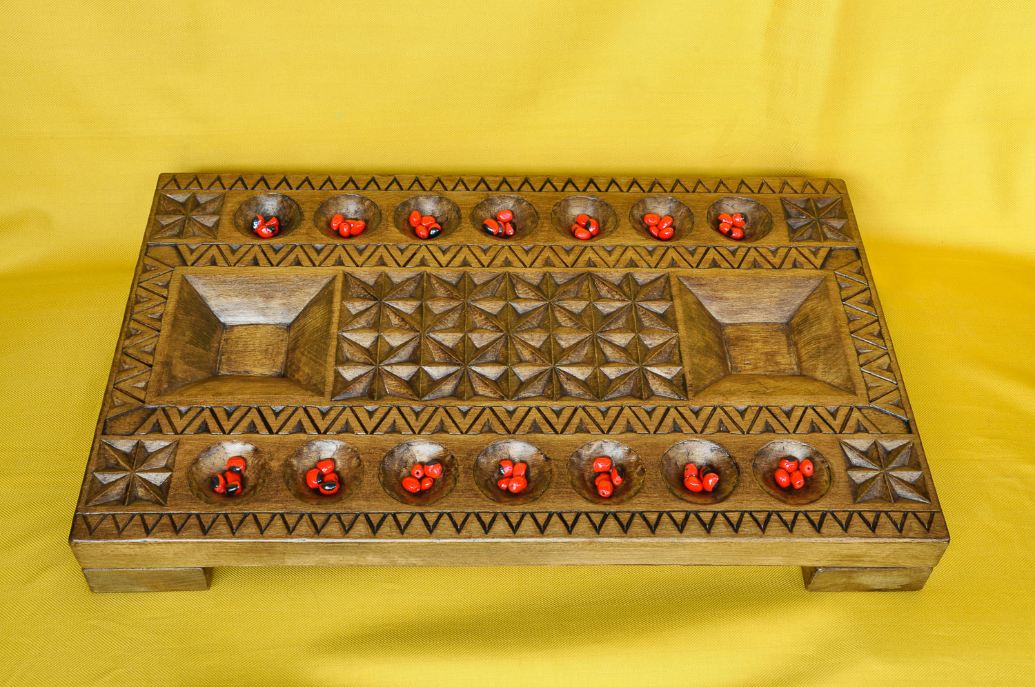 Bi ilarako mankala, 2×7. Taula landua. Biltegi bana ilaren artean. Launa bihi zuloetan, guztira 56 bihi.