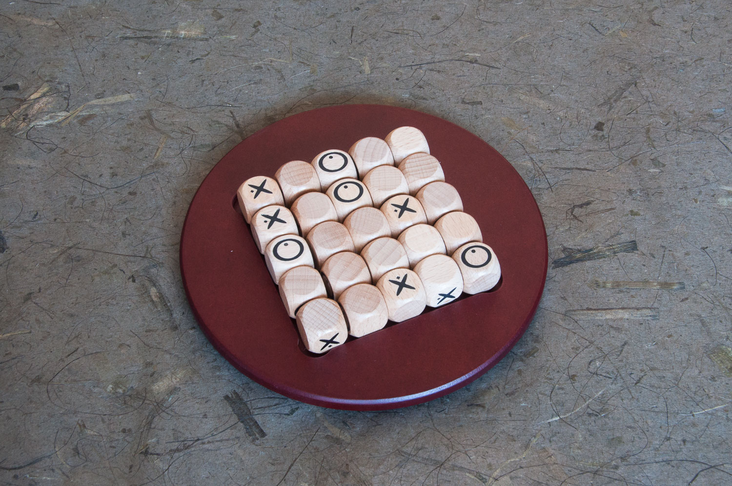Taulan karratu bat dago 5×5 kubo jatzeko. Hogeita bost kubo daude, auregi batean X eta aurkakoan O sinboloekin, eta besteak hutsik. 18 mm-ko aldea.