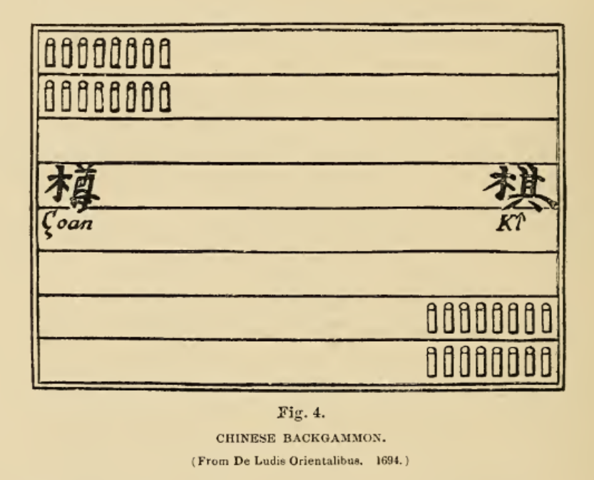 Honelako joko baten lehenengo berria, Europan, Thomas Hyde-k 1694 eman zuen De Ludis Orientalibus Libri Duo lanean. Liburu horretan Asia aldeko taula-jokoei buruz aritu zen. Tamalez, Hydek çoan kî izeneko joko txinatarra gainetik deskribatu zuen. Jokalari bakoitzak bi-hiru hazbeteko altuera zuten botila itxurako hamasei peoi zituen, kolore bereizgarrikoak, eta zortzi lerroko taula batean antolatuta zeuden, irudian ikusten den bezala. Peoien mugimenduak sei aurpegiko bi dadoren jaurtiketek kontrolatzen zituzten: ezkerretik eskuinera erlojuaren aurkako noranzkoan espazioetan zehar; zortzigarren espazioan zehar aurkariaren taulako aldera (hori espazio bat bezala zenbatuta); taularen beste aldean atzera jokalariaren ezkerraldera; eta gero taulan behera, jokoaren hasieran peoien jatorrizko posizioa hartzeko. Hori lortzen lehena zen irabazlea.