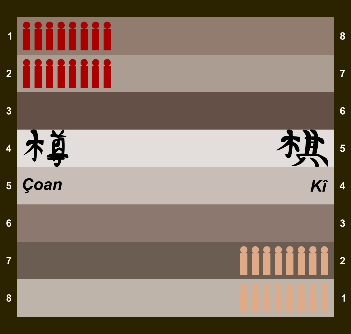 | Txinako çoan kî jokoaren taula eta hasierako posizioa. Thomas Hyde, De Ludis Orientalibus Libri Duo, 1694. |