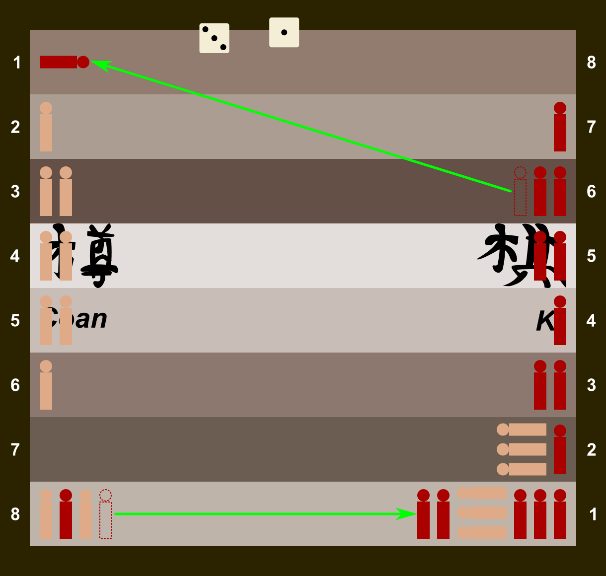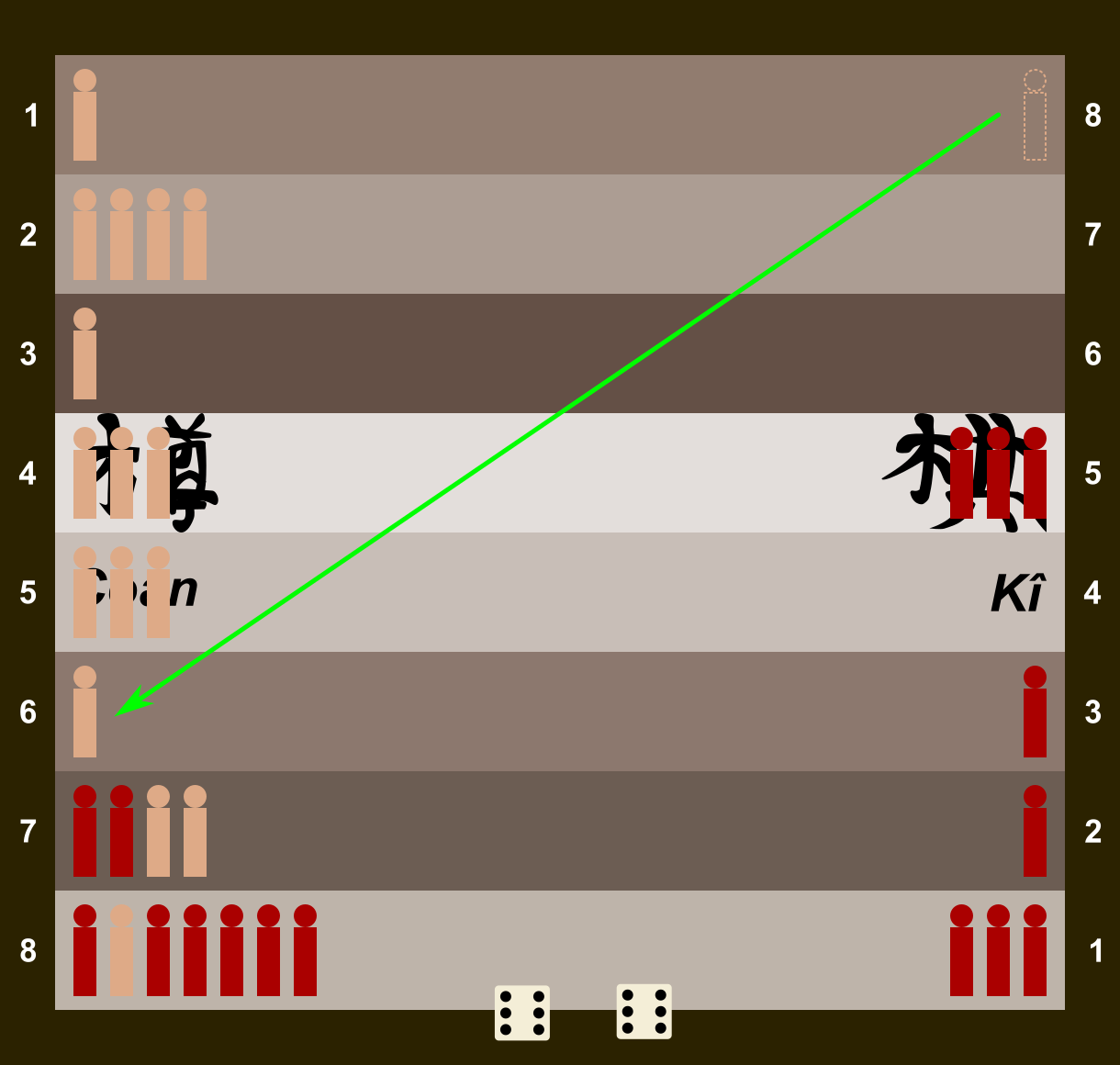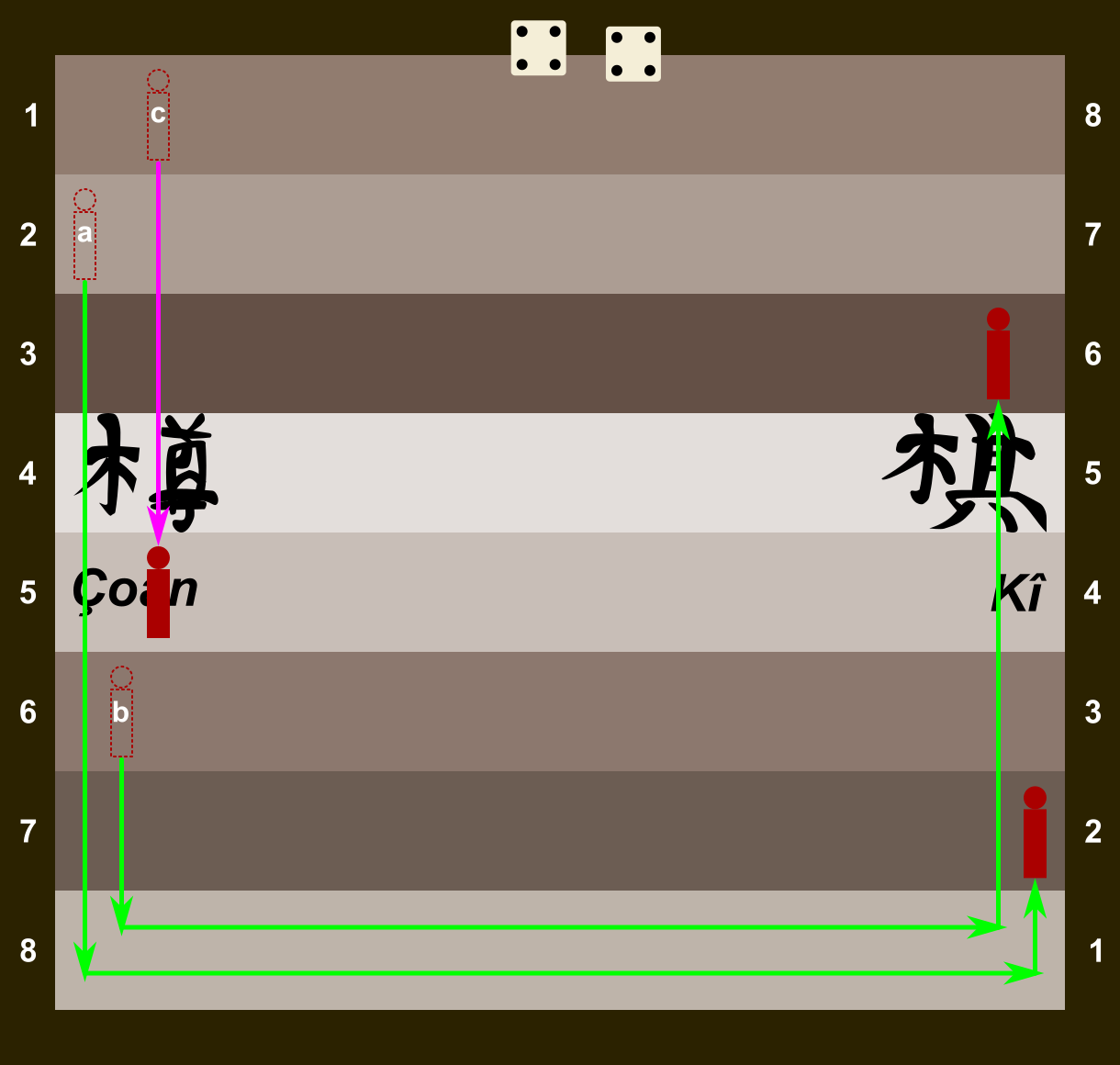 | Gorriek 4-4 jaurtiketa egin dute. Peoiak mugitzeko bi aukera dituzte. Bata, a eta b peoiak 8 posizio mugitzea aurrera. Bestea, c peoia 4 posizio mugitzea aurrera. | Zuriek 5-6 segida atera dute. Peoiak mugitzeko bi aukera dituzte. Bata, a peoia 5 posizio eta b peoia 11 posizio mugitzea aurrera. Bestea, c eta d peoiak 10 posizio mugitzea aurrera eta gero d peoia (edo c peoia) posizio bat gehiago mugitzea aurrera. |