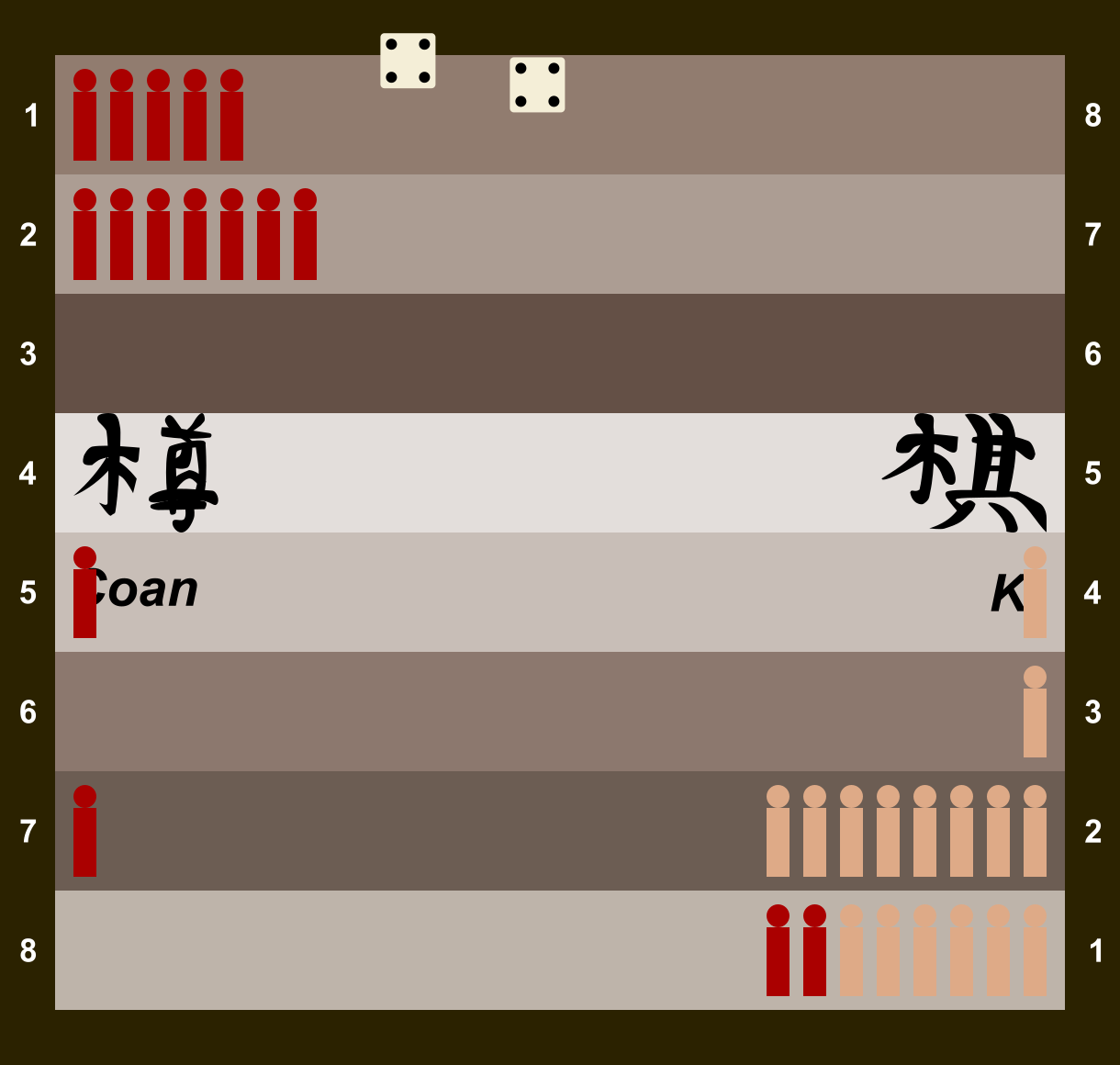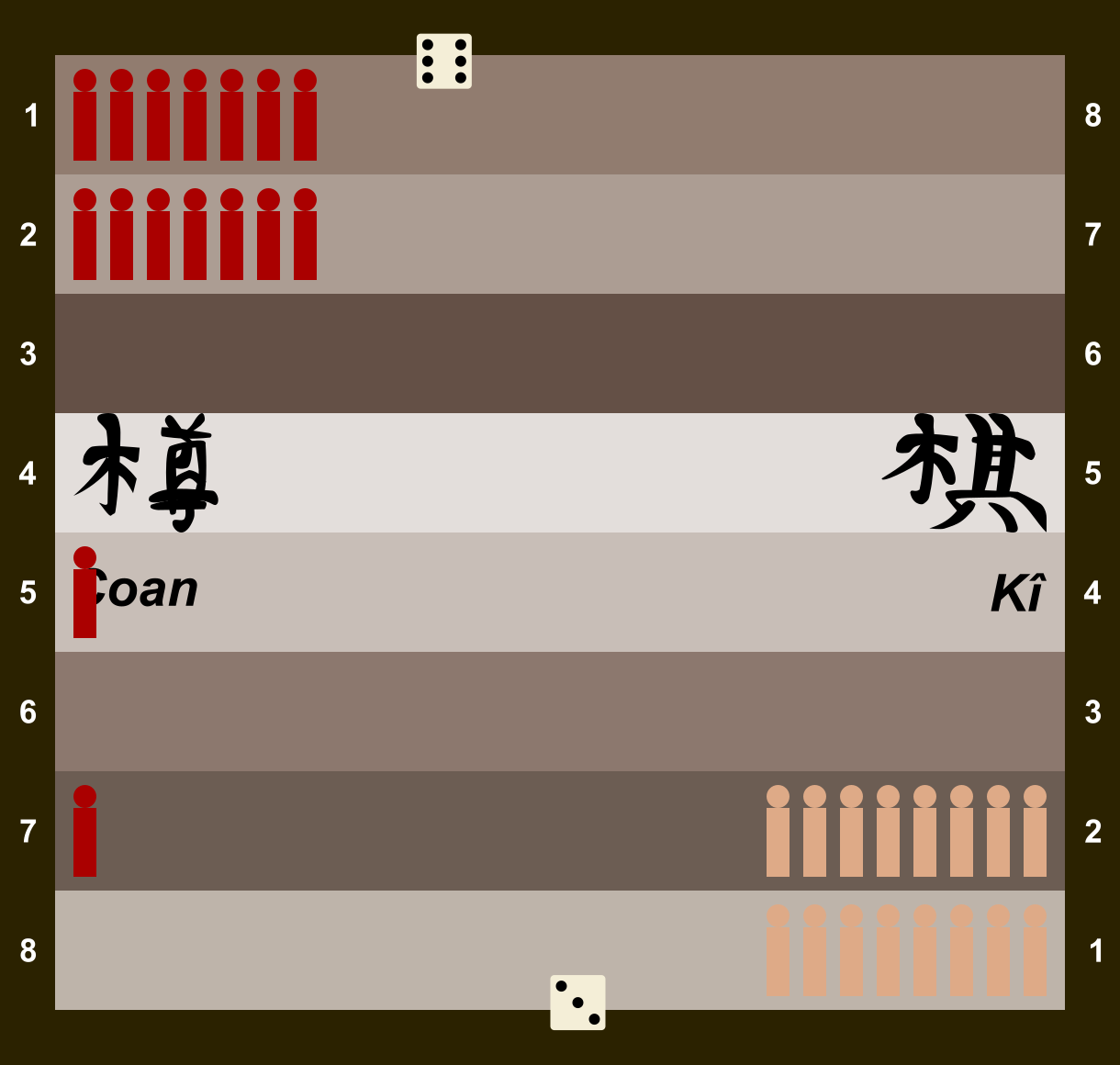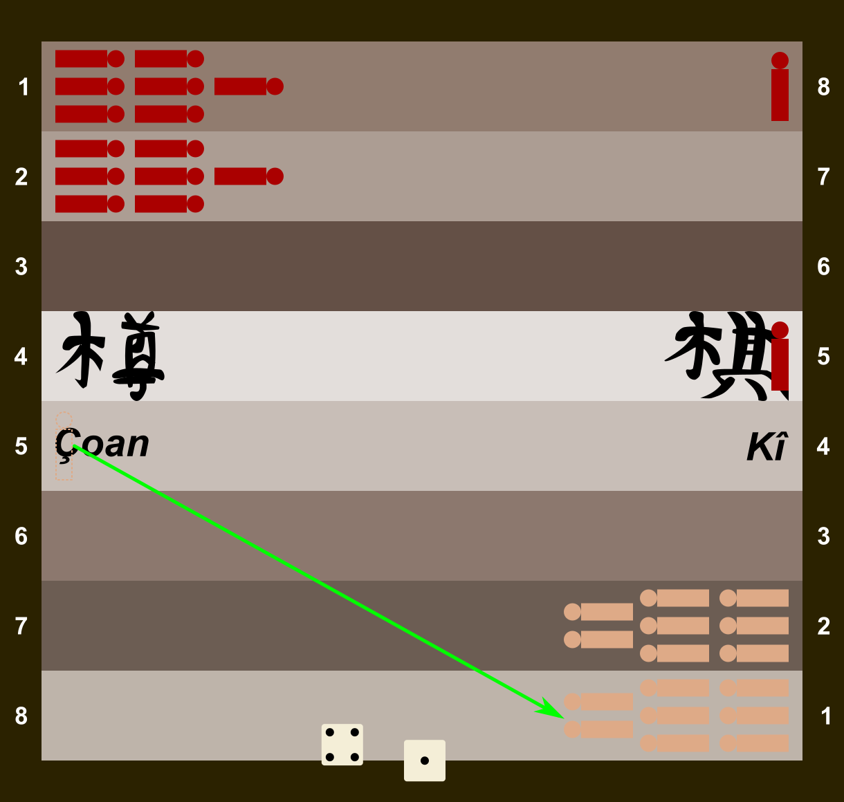 | Gorriek 4-4 jaurtiketa egin dute. Peoiak mugitzeko bi aukera dituzte. Bata, a eta b peoiak 8 posizio mugitzea aurrera. Bestea, c peoia 4 posizio mugitzea aurrera. | Zuriek 5-6 segida atera dute. Peoiak mugitzeko bi aukera dituzte. Bata, a peoia 5 posizio eta b peoia 11 posizio mugitzea aurrera. Bestea, c eta d peoiak 10 posizio mugitzea aurrera eta gero d peoia (edo c peoia) posizio bat gehiago mugitzea aurrera. |