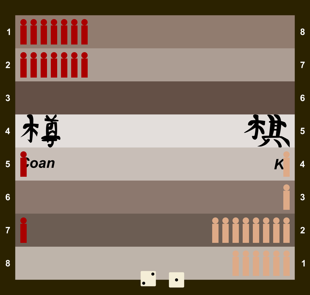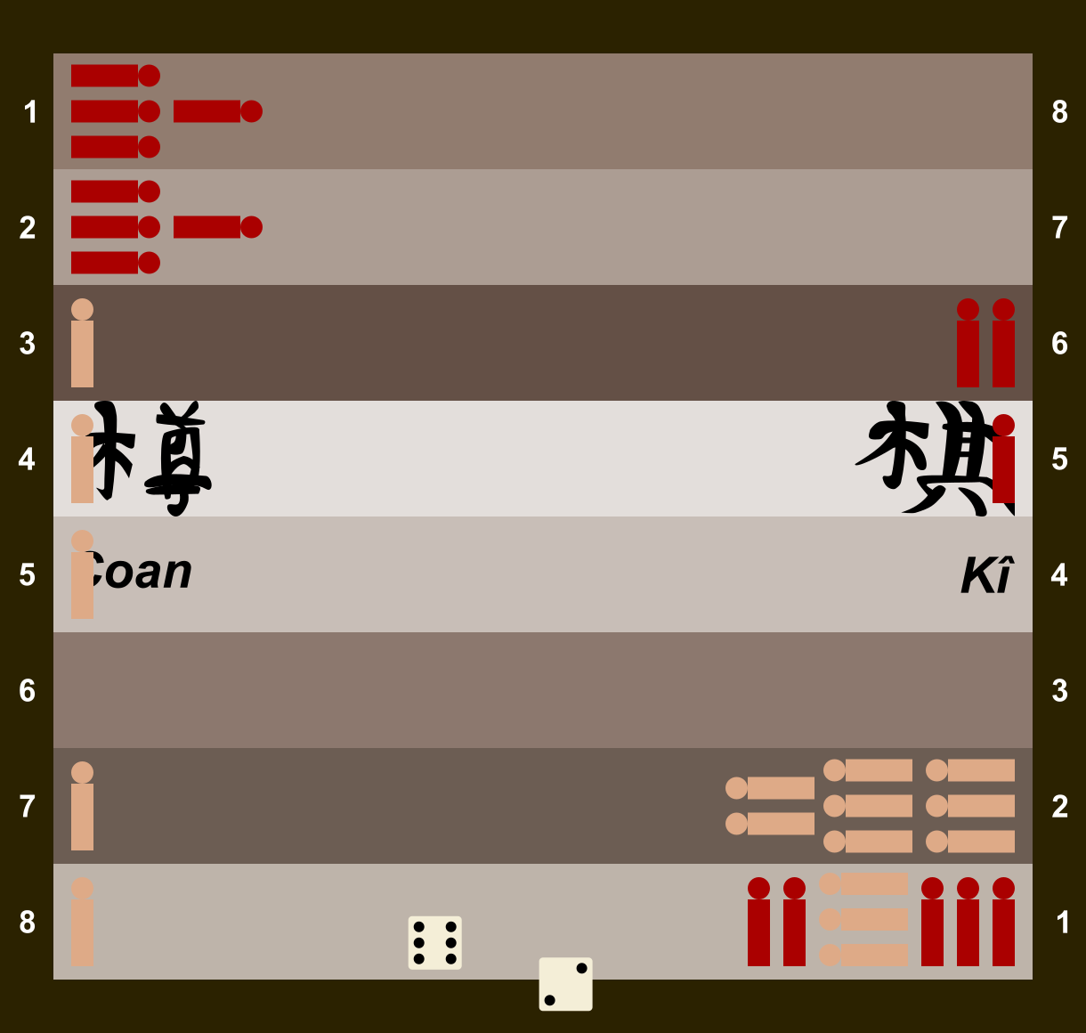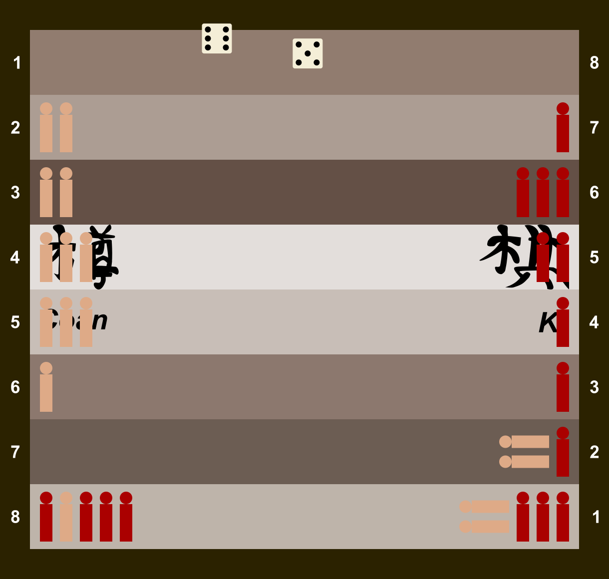 | Partida hasiera. Gorriek 6 eta zuriek 3 atera dute. Gorriek peoi bat 3 posizio eta beste peoi bat 6 posizio mugitu dituzte. | Zuriek 1-2 segida atera dute. Bi peoi 2×1 posizio eta horietako bat posizio bat gehiago mugitu dituzte. | Gorriek 4-4 bikoitza atera dute. Bi peoi 8 posizio mugitu dituzte. |