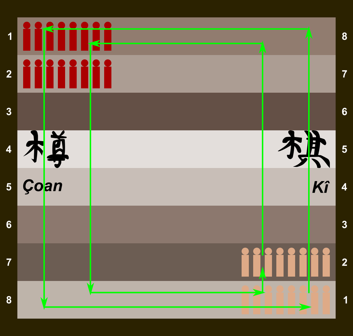 Peoiak eskuinerantz, aurreko aldera, ezkerrerantz eta norberaren aldera mugituko dira, hau da, erlojuaren orratzen aurkako noranzkoan: 1. edo 2. laukitik 8. laukira; norberaren 8. laukitik aurkariaren 1. laukira; hortik, gero, aurkariaren 8. laukira; eta, azkenik, hortik norberaren 1. edo 2. laukietara. Aurreko aldera edo norberaren aldera egiten denean, puntuazioaren puntu bat zenbatu behar da.