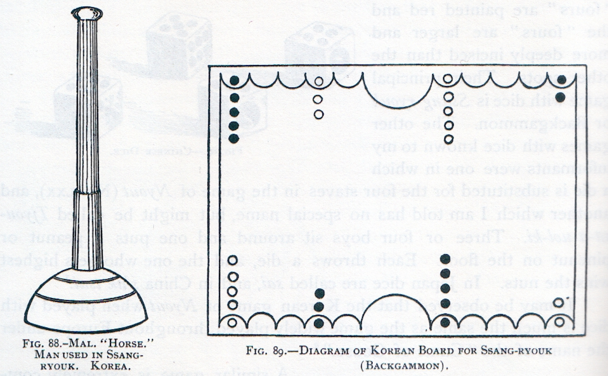 | Koreako ssang-ryouk jokoaren peoia eta taula.Stewart Culin, Korean Games. Dover Publications, Inc., New York, 1895. |