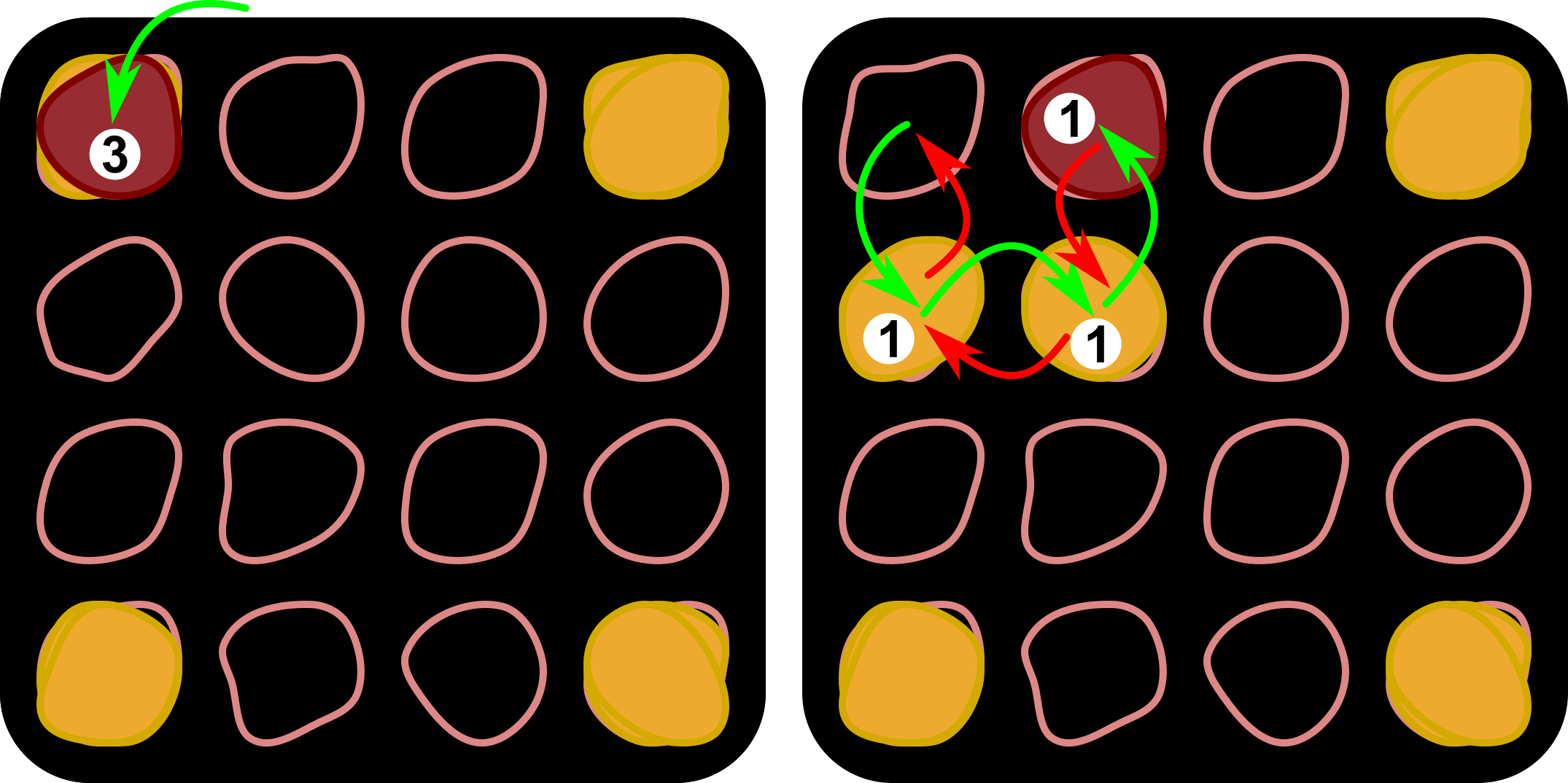 | 1. urratsa: jokalari batek harri iluna goiko ezkerreko erpinean jarri du. 2. urratsa: erpineko hiru harriak ondoko laukietan utzi ditu banan-banan; gezi gorriek adierazten dute ezin dela atzera egin. |